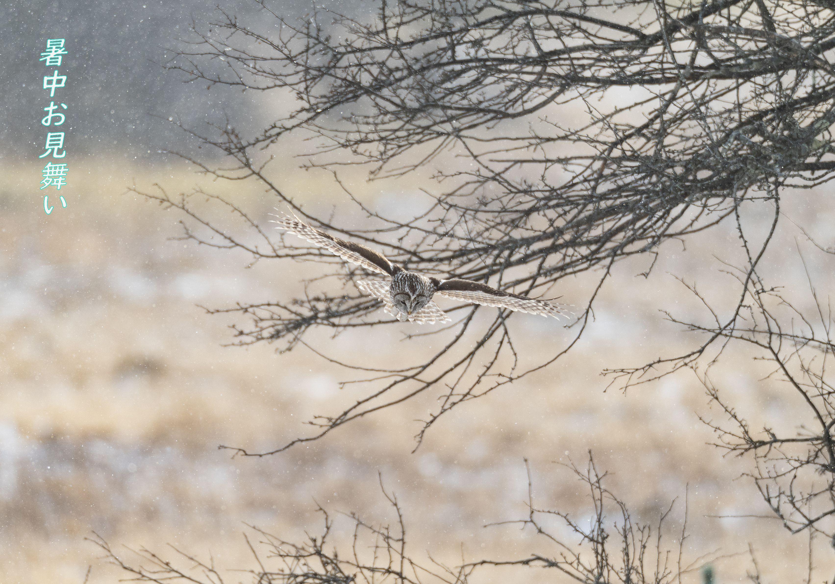 毎日猛暑続きで疲れますねぇ~♪ 写真の方は今年の元旦 極寒の雪降る中でのフクロウ飛翔ですです。 こう毎日が猛暑で暑いと、冬の寒さが少しでも欲しくなりますね。(^_-)-☆