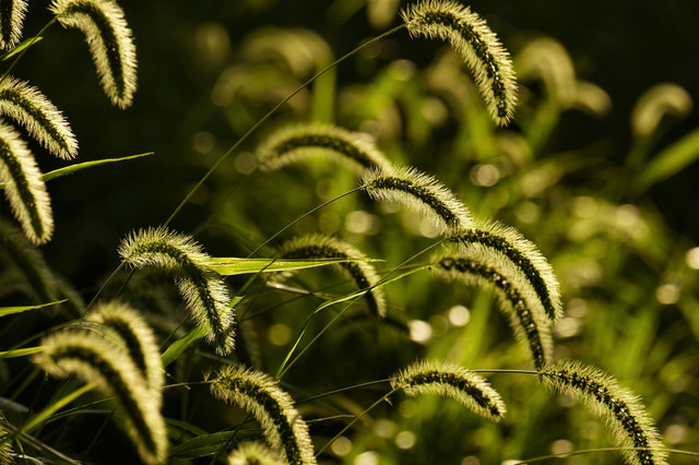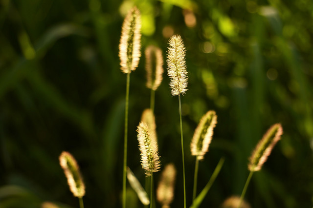 青々と稲穂のようなネコジャラシを撮りたくて空き地に行きました。 ファインダーを覗いたら、青々どころか金色に輝いていてとても綺麗でした。 強烈な西日が眩しくて、猛烈に暑かった(^^; しゃがみ込んで雑草を撮っている姿は、見られたくないですね。