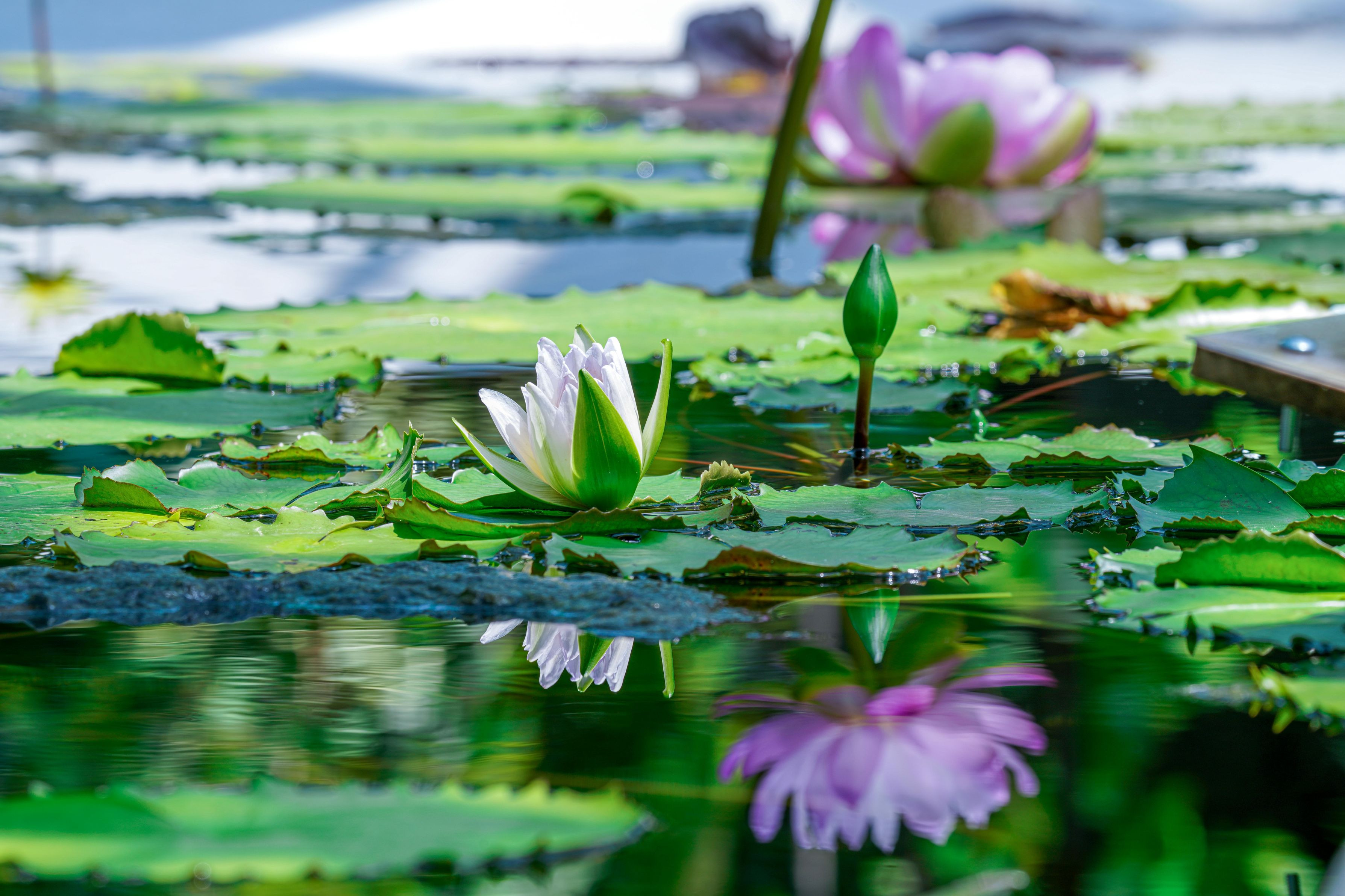 水面に映っているのはつぼみの後ろに見えている茎の花。