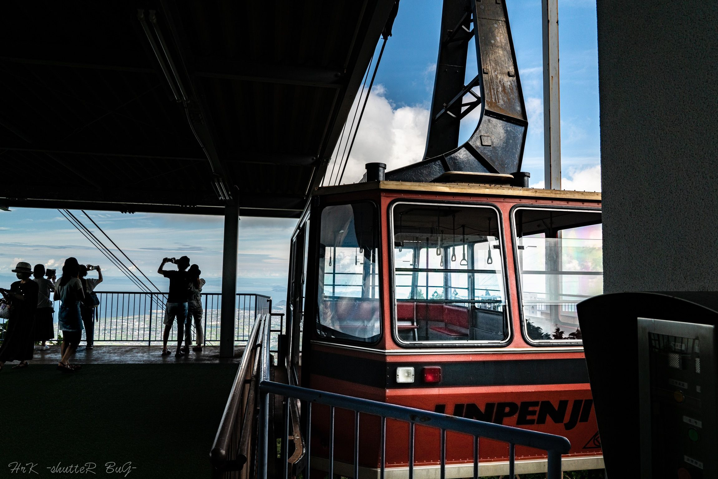 ロープウェイの頂上で景色を楽しんでいる人達と役目を終えたゴンドラの一枚。 こうして何百、何千回と人を運んでいるのでしょうね。