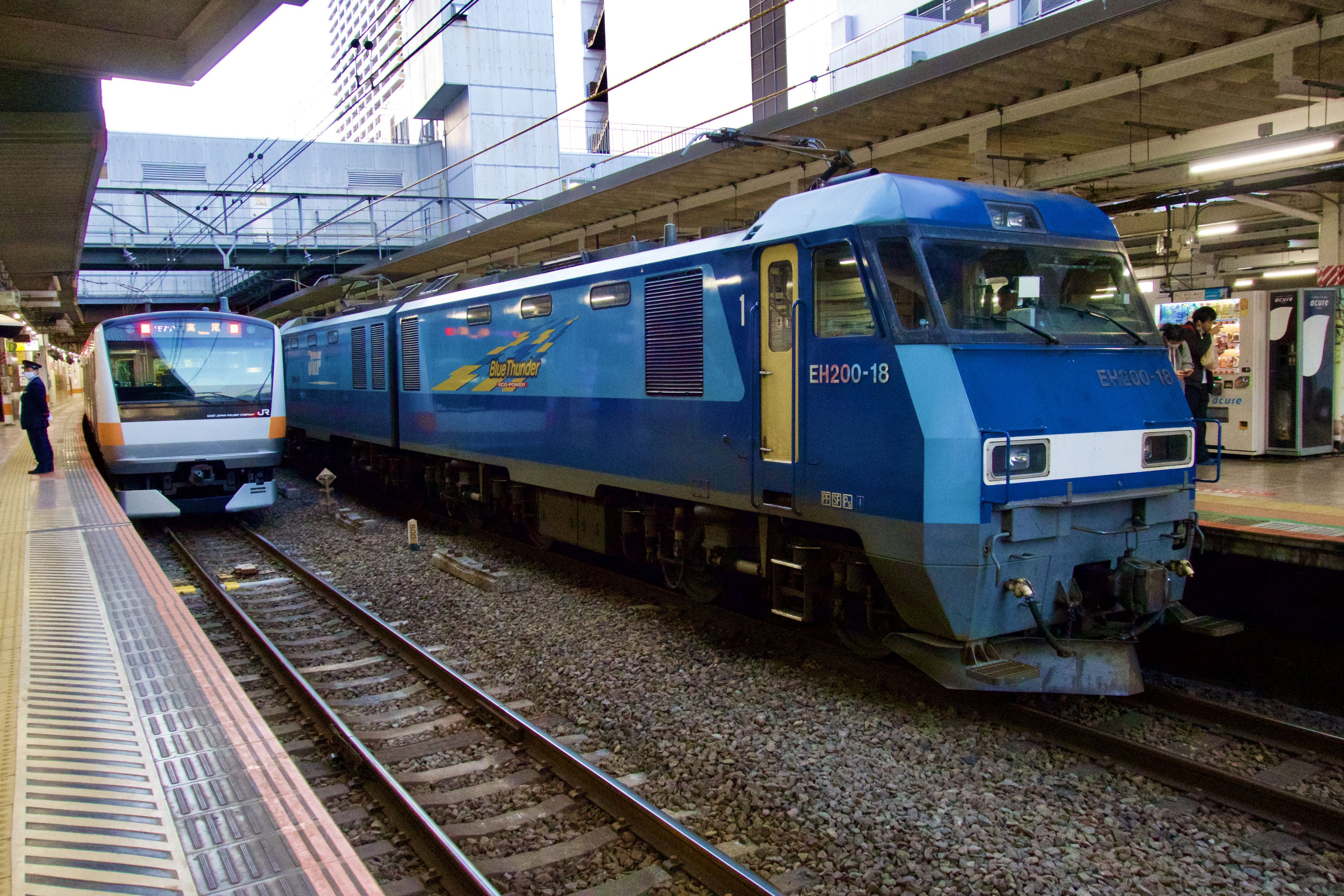 八王子駅でのE233系とEH200貨物列車の離合