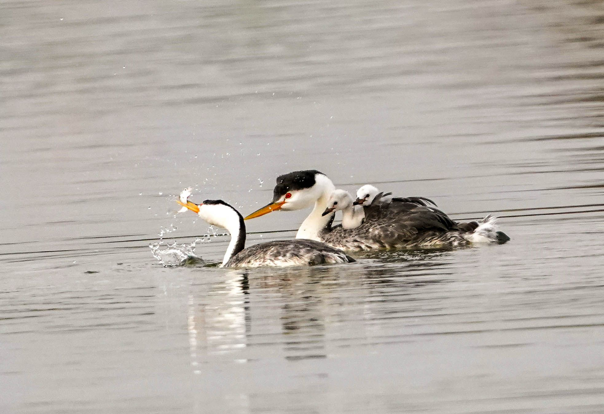 撮影地:San Joaquin Wildlife Sanctuary, Irvine, California メスの背中に載っている2羽の幼鳥がオスが捕まえた魚を欲しそうに見ている姿が可愛いです。