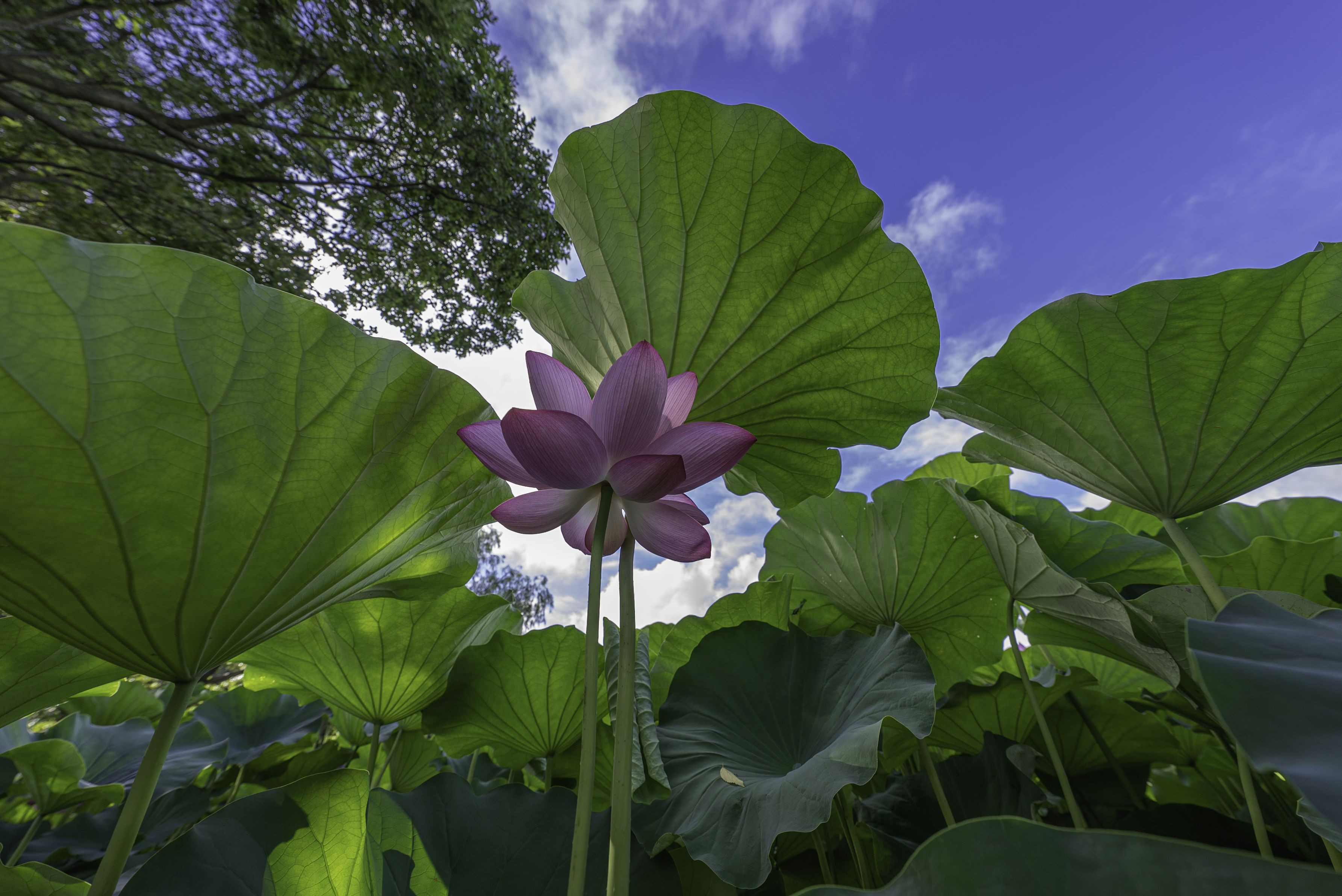 長く伸びた三渓園の蓮。 八頭身美人を見上げるようにローアングルで撮影。