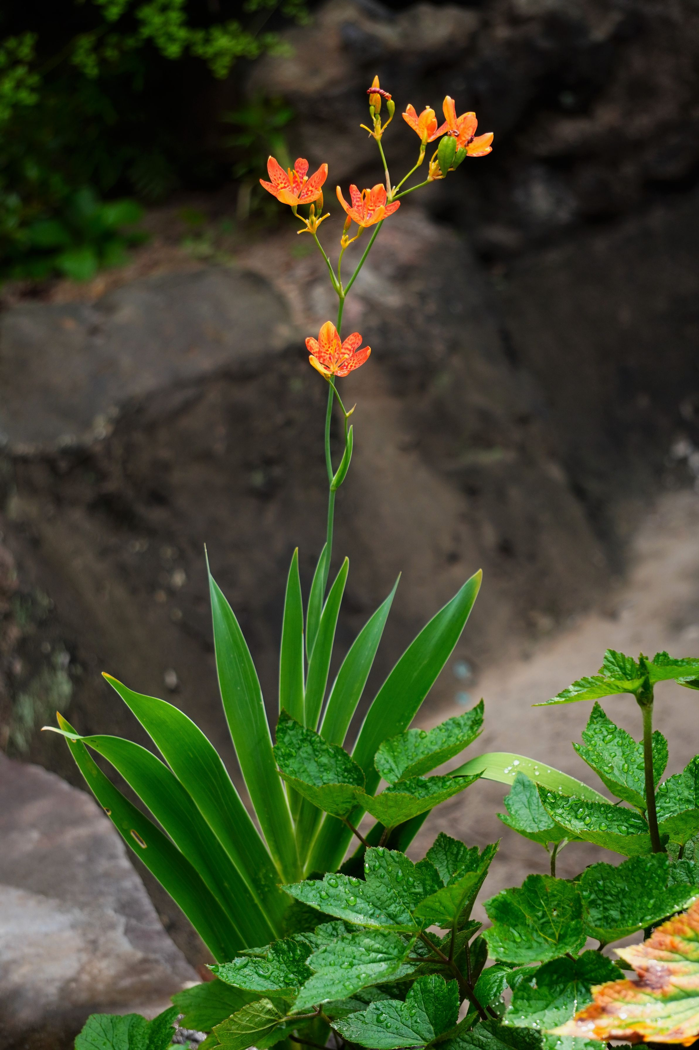 ヒオウギは、扇を広げたような葉っぱの形から名付けられたと言われていて、祇園祭の期間中、玄関先や床の間に飾られるそうです。 種から育てたヒオウギ、シャッキっと背筋を伸ばして凛として咲く姿が好きです。 秋になると真っ黒い種ができます。