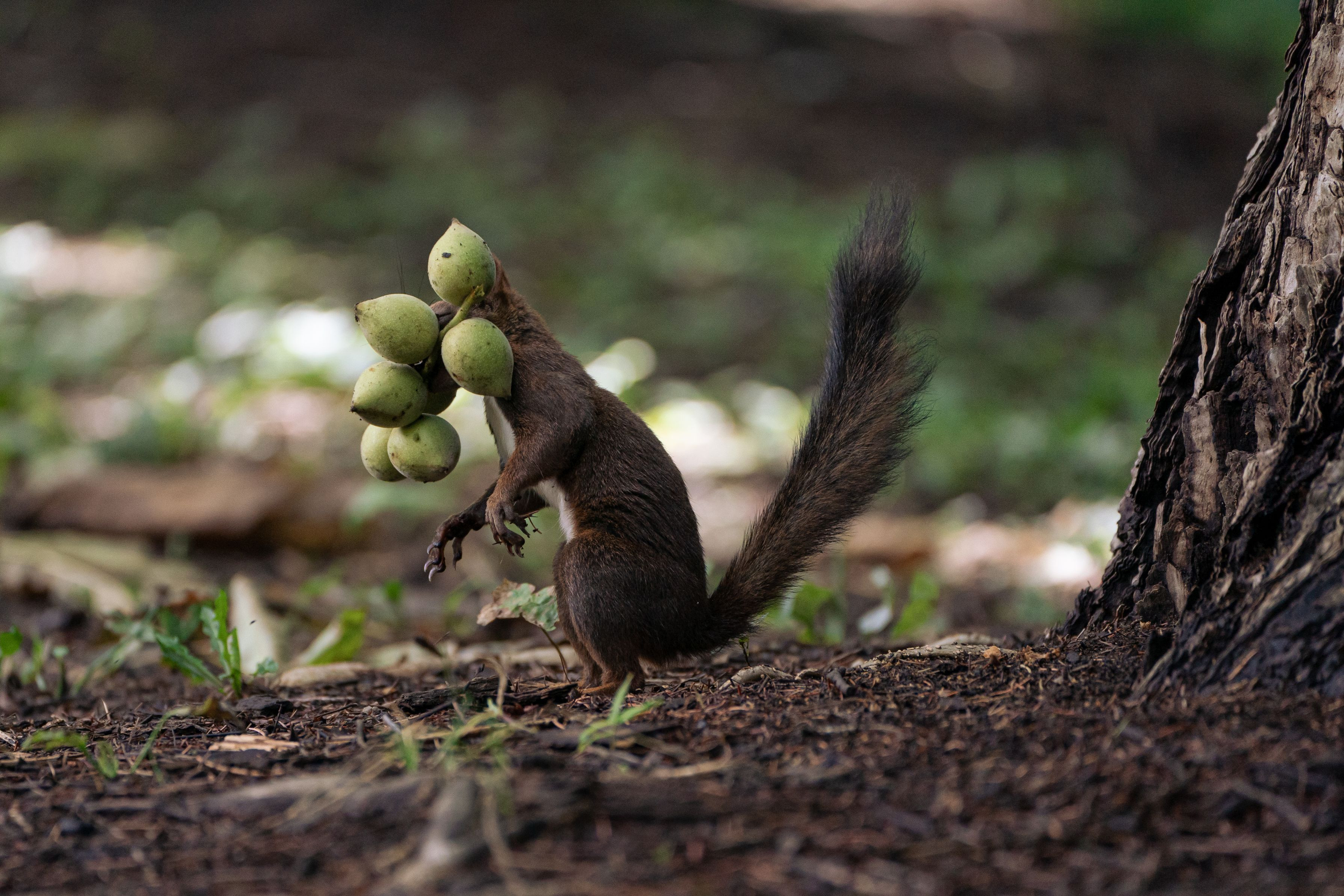 随分と強引なエゾリスさん。青いオニグルミの房を、何とか咥えて運ぼうとしていたが、上手くいかず。 「重い…」 どうにか持とうとしてみるけど、やっぱり運べない。そして、ついにエゾリスは奥の手を出した。 かくなる上は…一個ずつバラバラにして埋めてました(笑)