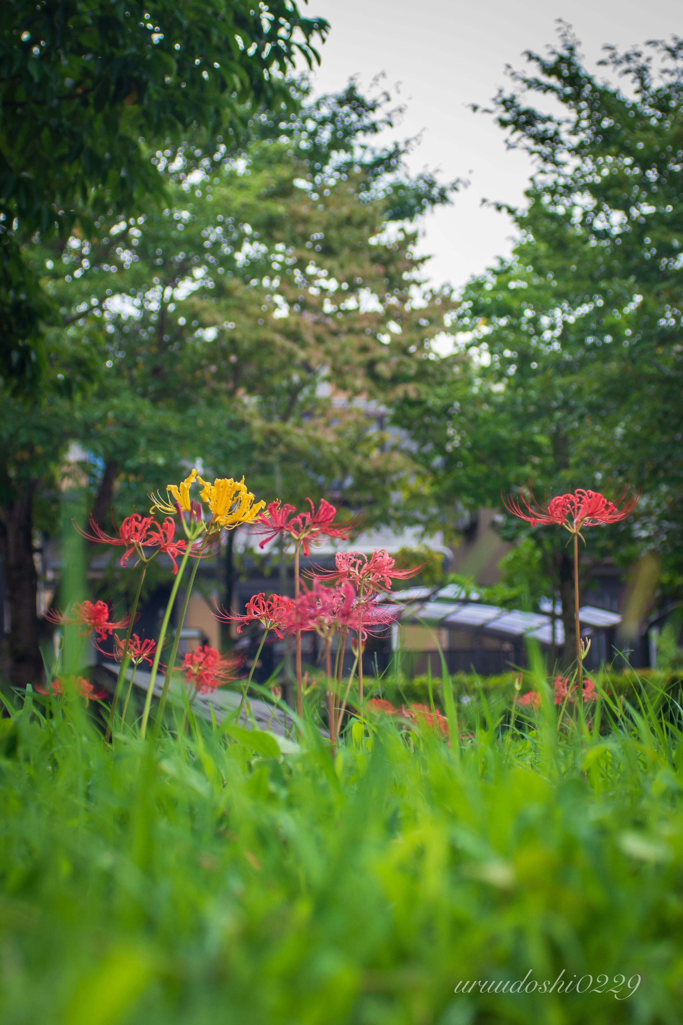 早咲きの彼岸花に紛れた黄色の彼岸花が印象的でした。 2021/08/26撮影