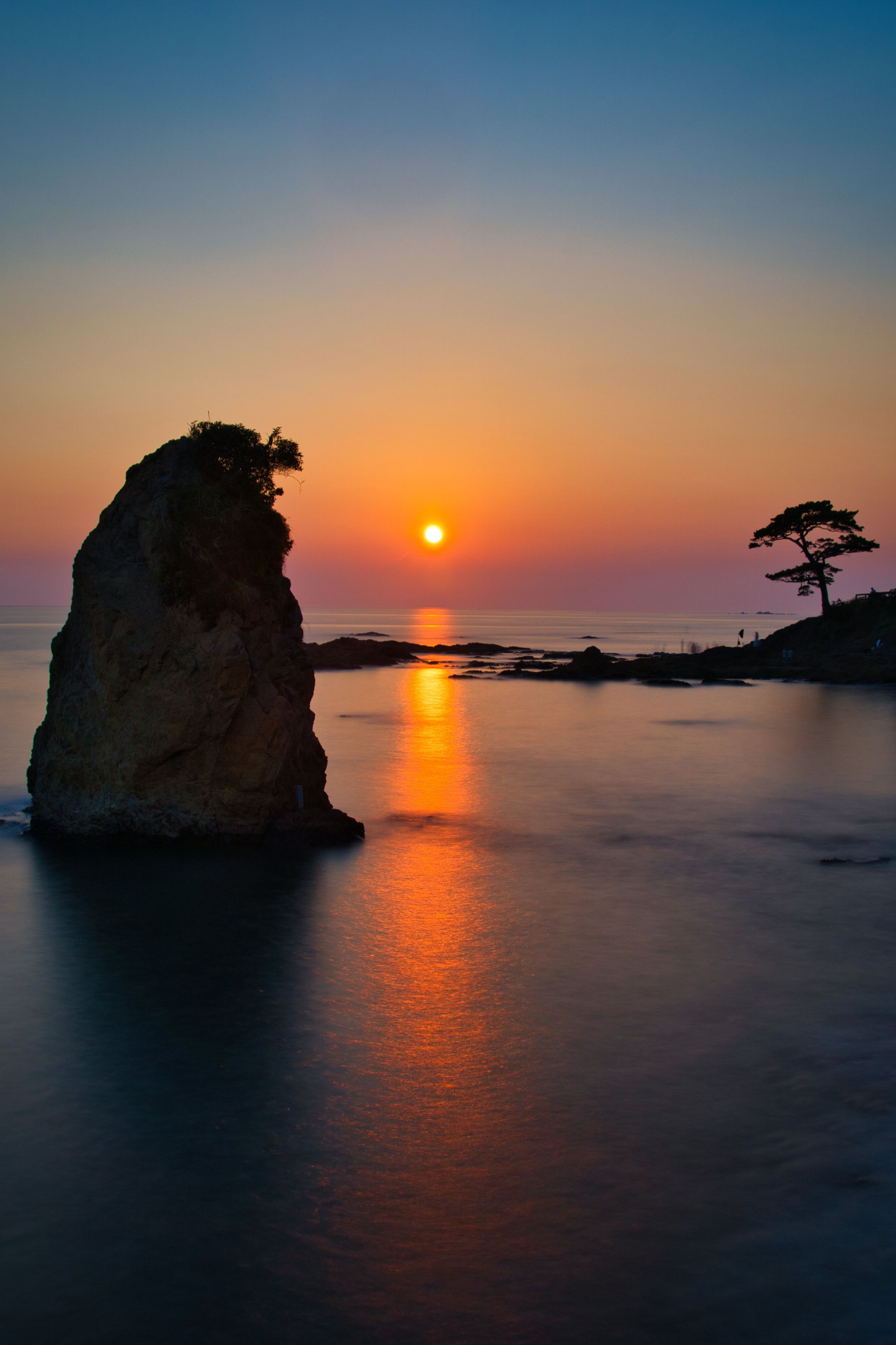 ダイヤモンド富士狙いで皆さん三脚立て待機状態。 私は卓上三脚を堤防に置いて長時間露光30秒で立石海岸夕陽風景を表現しました。 海岸に突き出た大きな奇岩「立石」「松の岩場」の浮かぶ海面に夕陽の道 今回は見えませんでしたが富士山を背景にした立石海岸は絶景です。