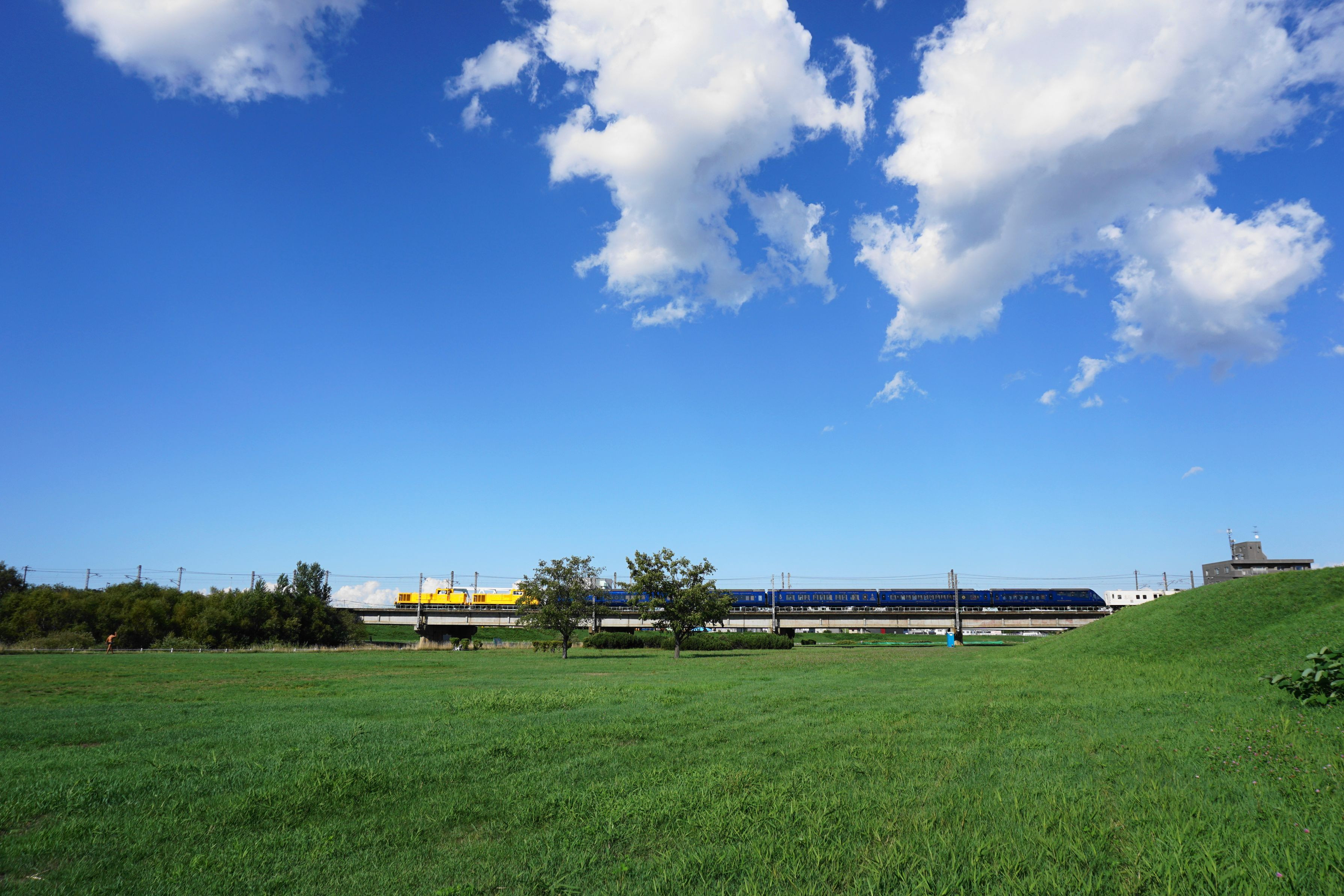 ひまわりとイネと電車