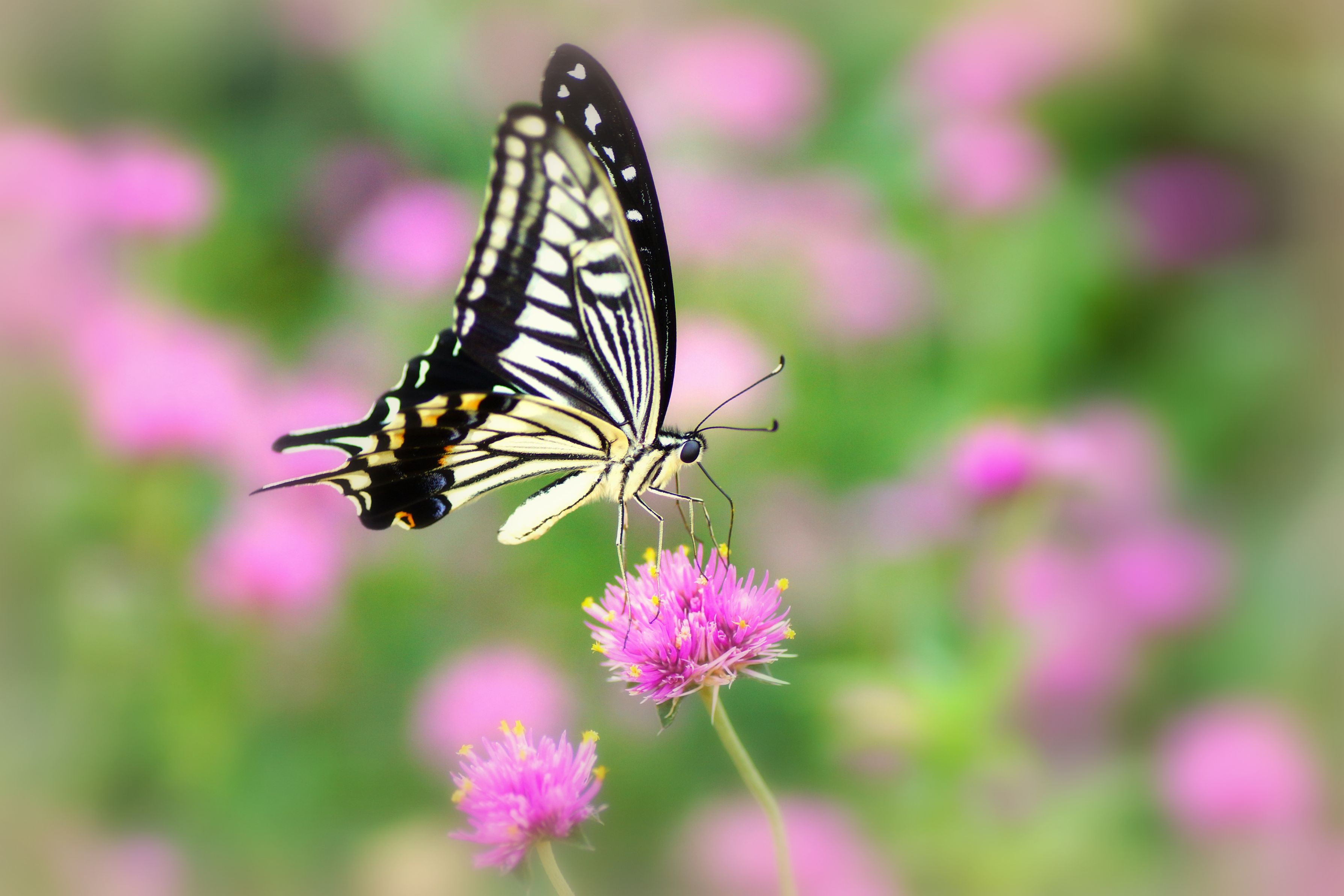 千日紅にやって来たナミアゲハです。