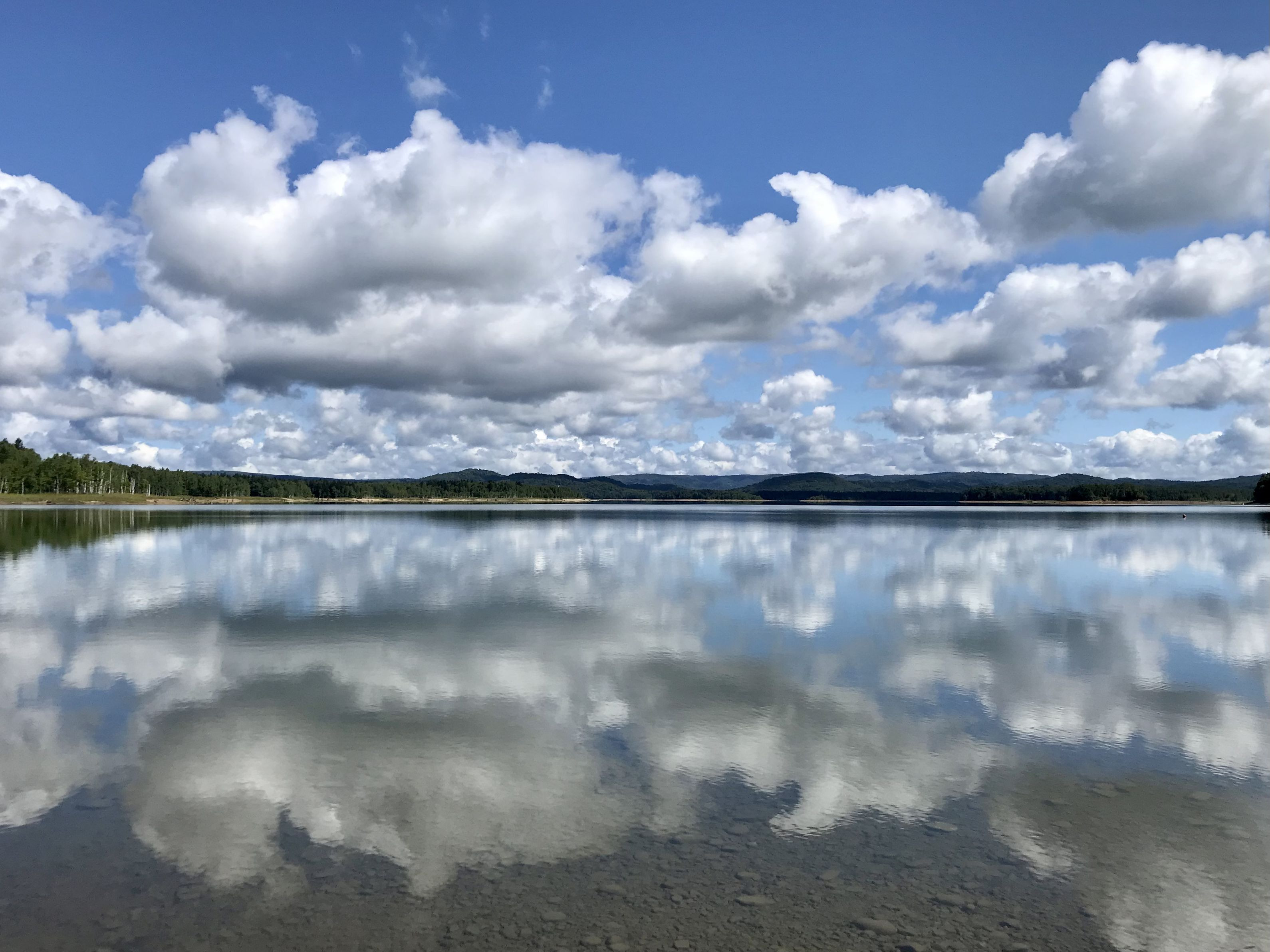 朱鞠内湖の湖面を渡る風が一瞬止んで鏡のようになりました。