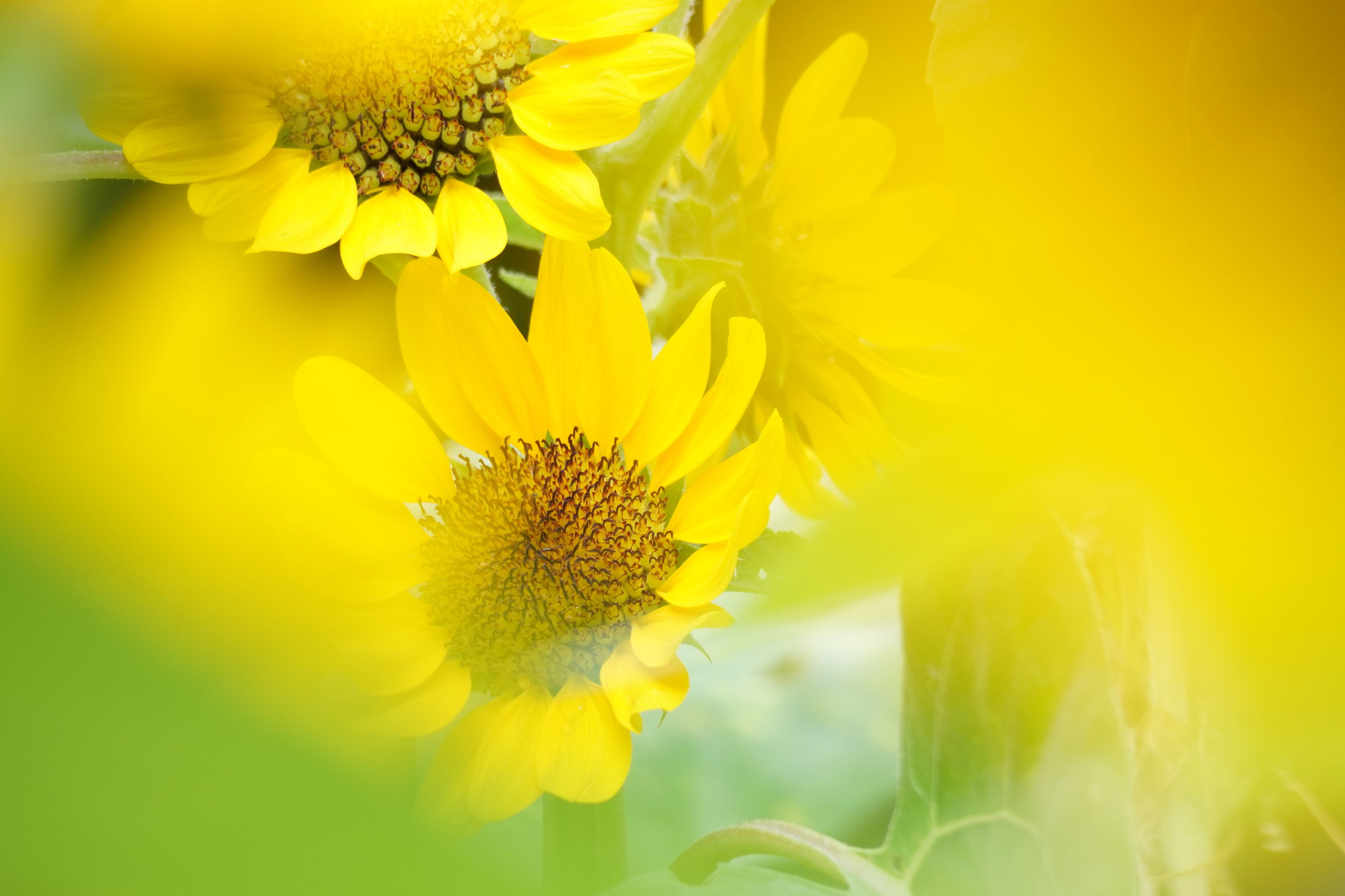 新宿中央公園にて 前ボケを意識して奥の方に咲いているひまわりを撮りました。