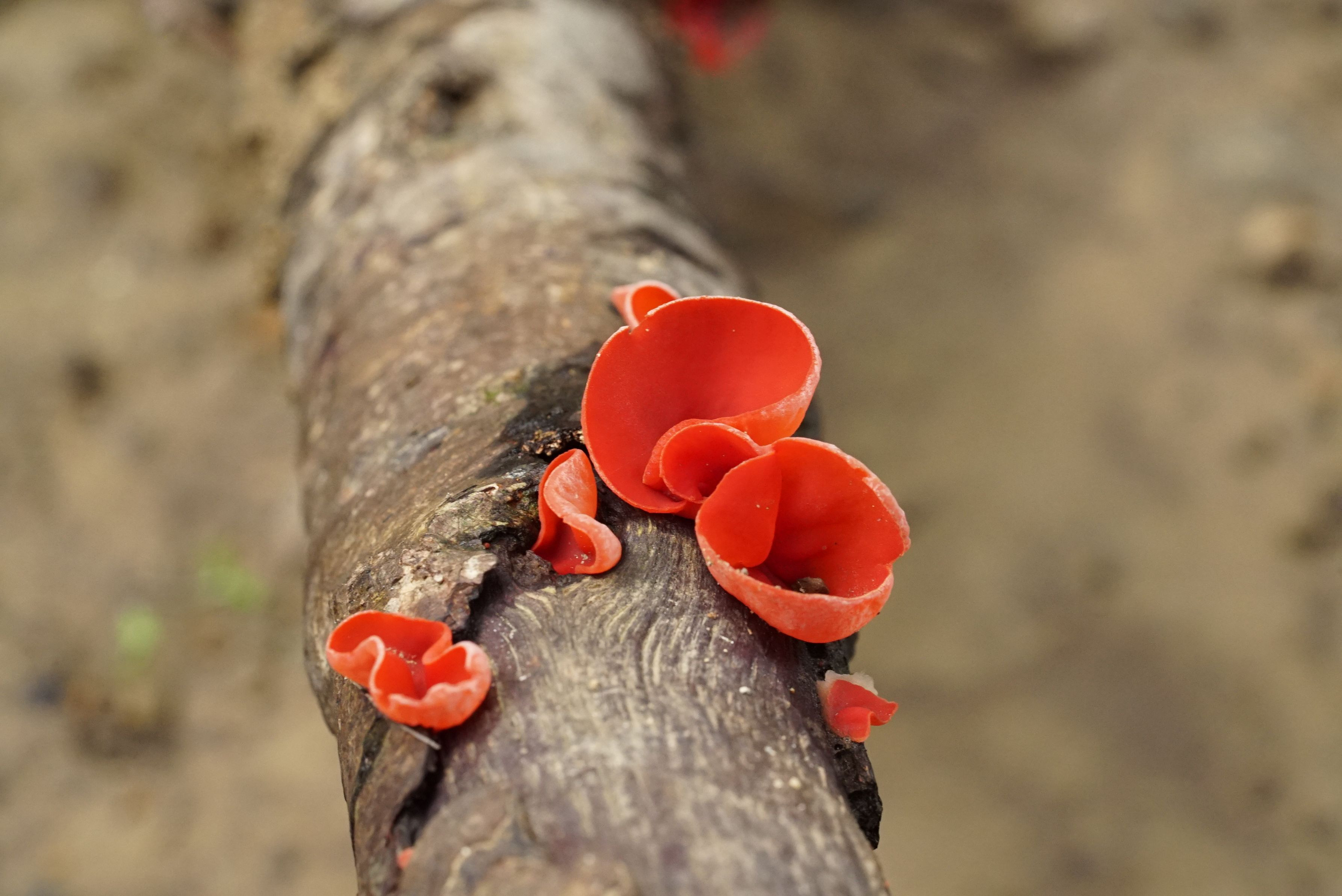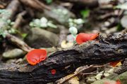 山に行くと真っ赤なベニチャワンタケが生えていました。 プラスチック片かと思いましたが近寄るとキノコでした。