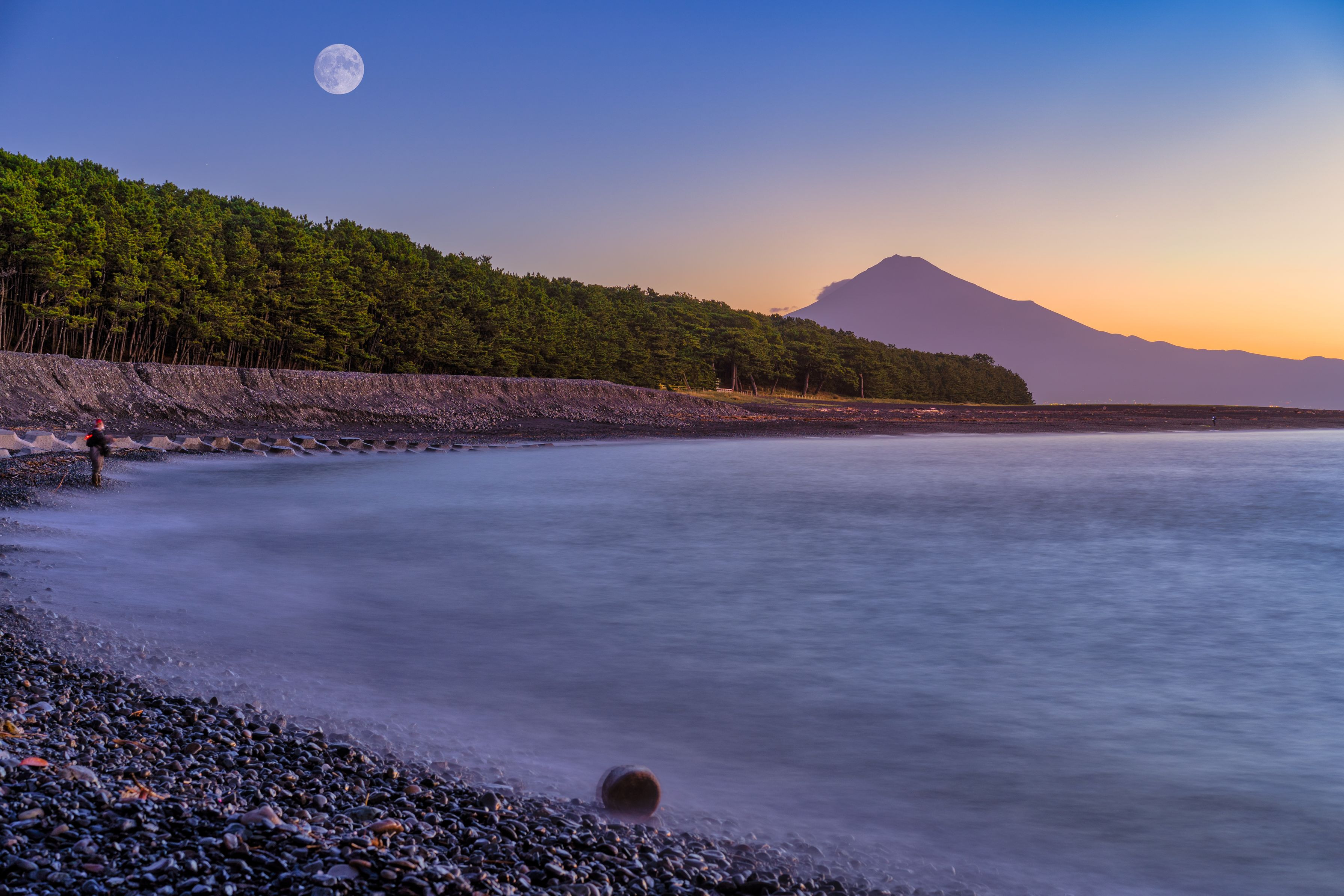 スローシャッターで凪ぎを表現したものに、その夜に撮影した、中秋の満月前夜の月を合成し、手前に波に揺れる丸太を写しこんで、静寂と動きを表現したつもりです。