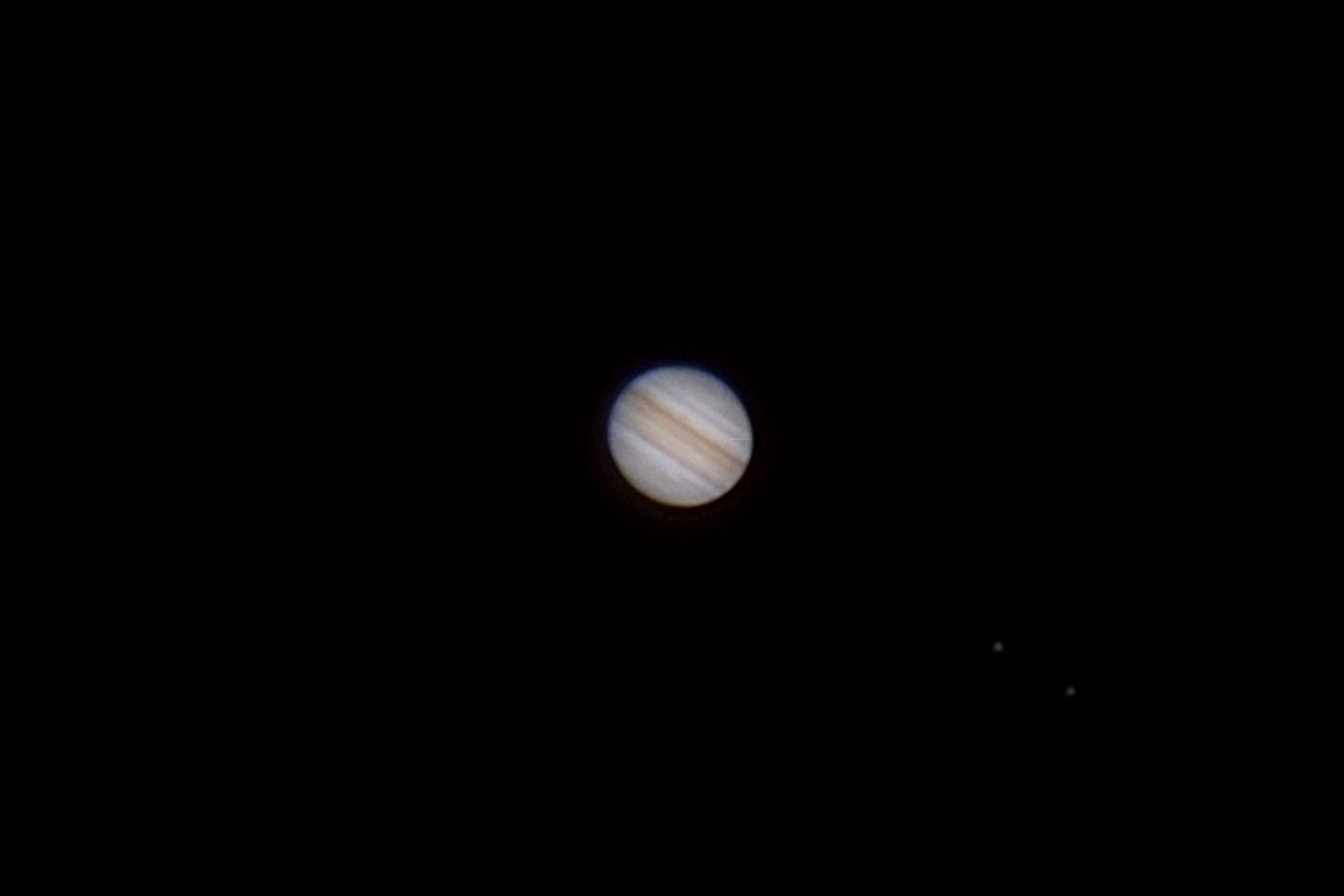 シーイングが良くきれいだったので、木星と土星の写真をアプリで拡大してみました。超解像ズームと同様の効果があるようです。100枚コンポジット画像を拡大後にウェーブレット加工してあります。