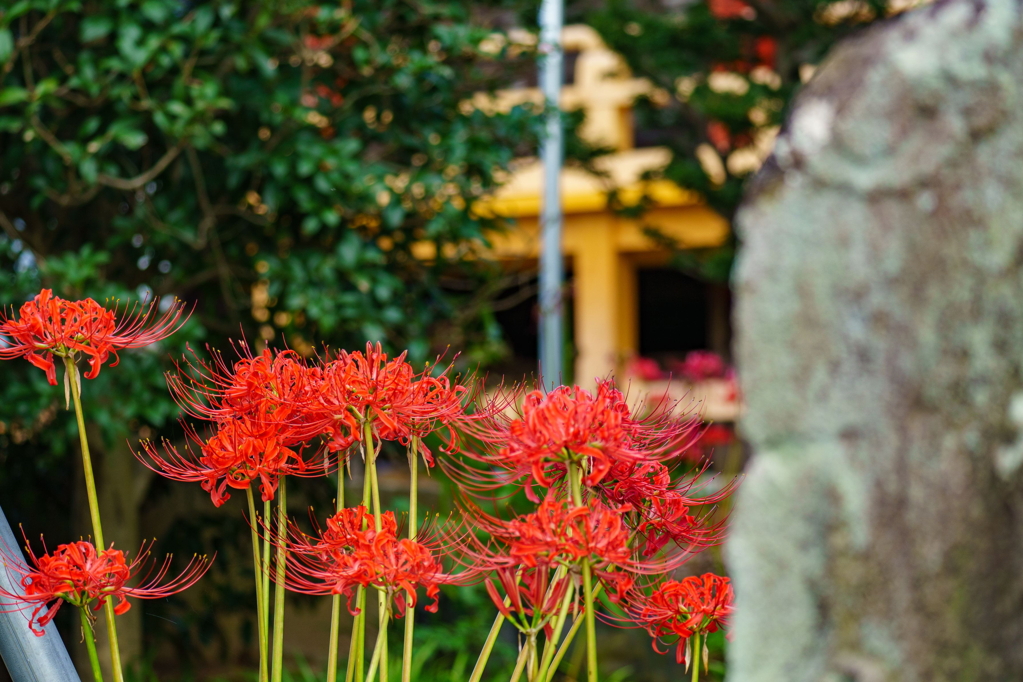 ウォーキングコースにあるお寺の1つに今年もヒガンバナが咲いていました。背景に、ほのかに(笑)見える欄干は、この夏、修復されたものです。