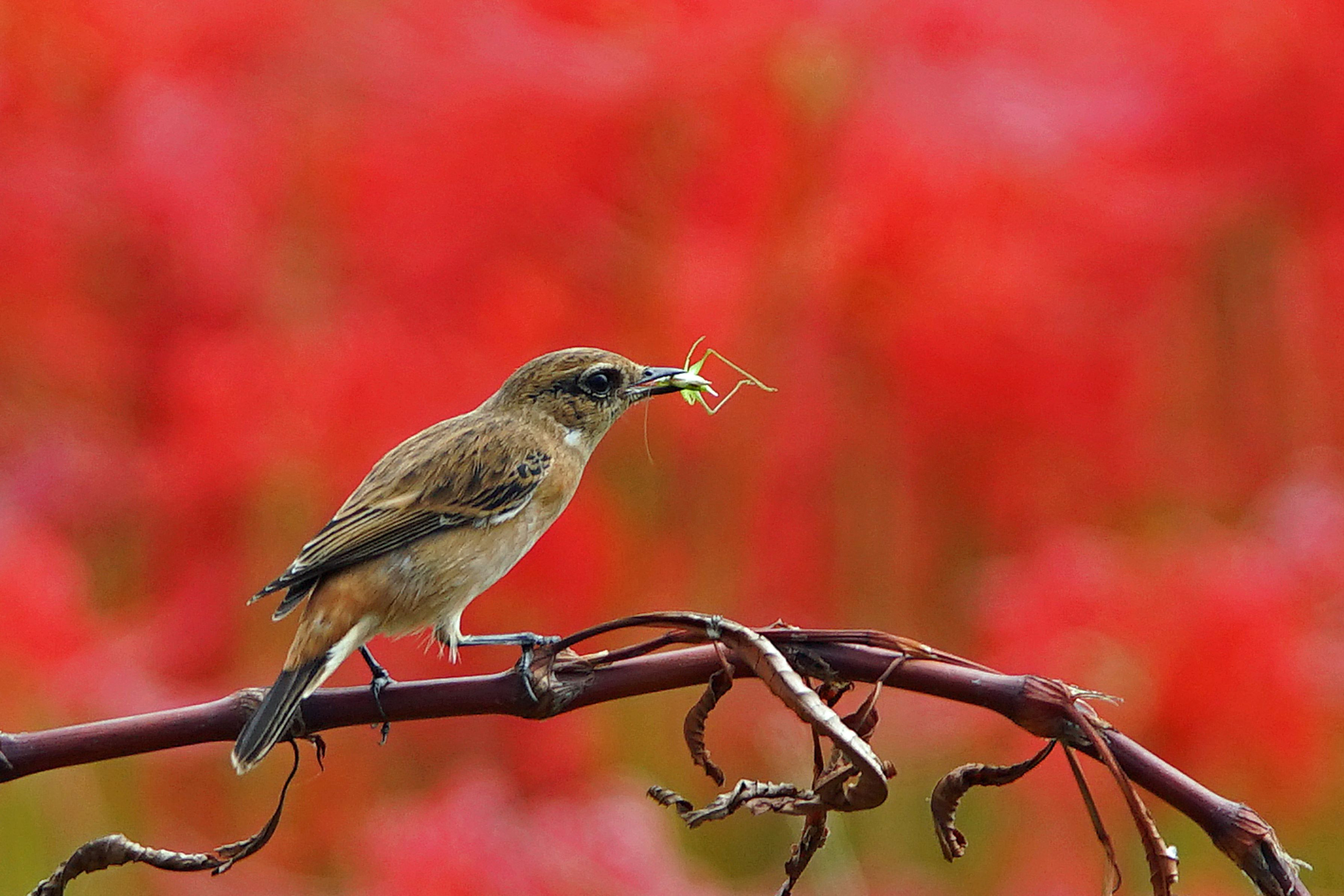 ノビタキの餌場の休耕田の畔には、彼岸花が 今を盛りと咲き誇っている。 一羽のノビタキが虫を銜えて枝に止まった。