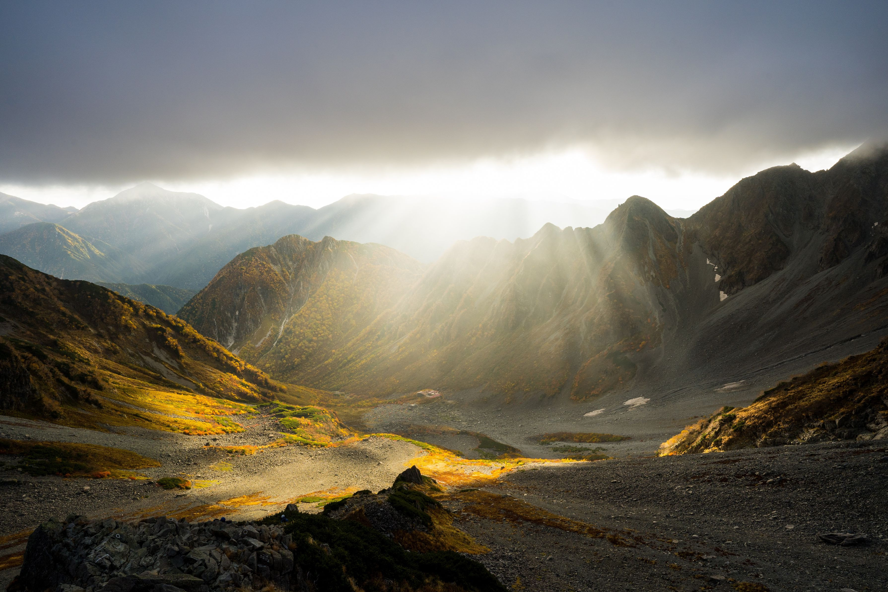 奥穂高からの下り、この日はガスっていたのでカメラの出番は無いと思いザックにしまっていたのですが、雲の合間から光が差してきたので急いでカメラを取り出し撮影しました。