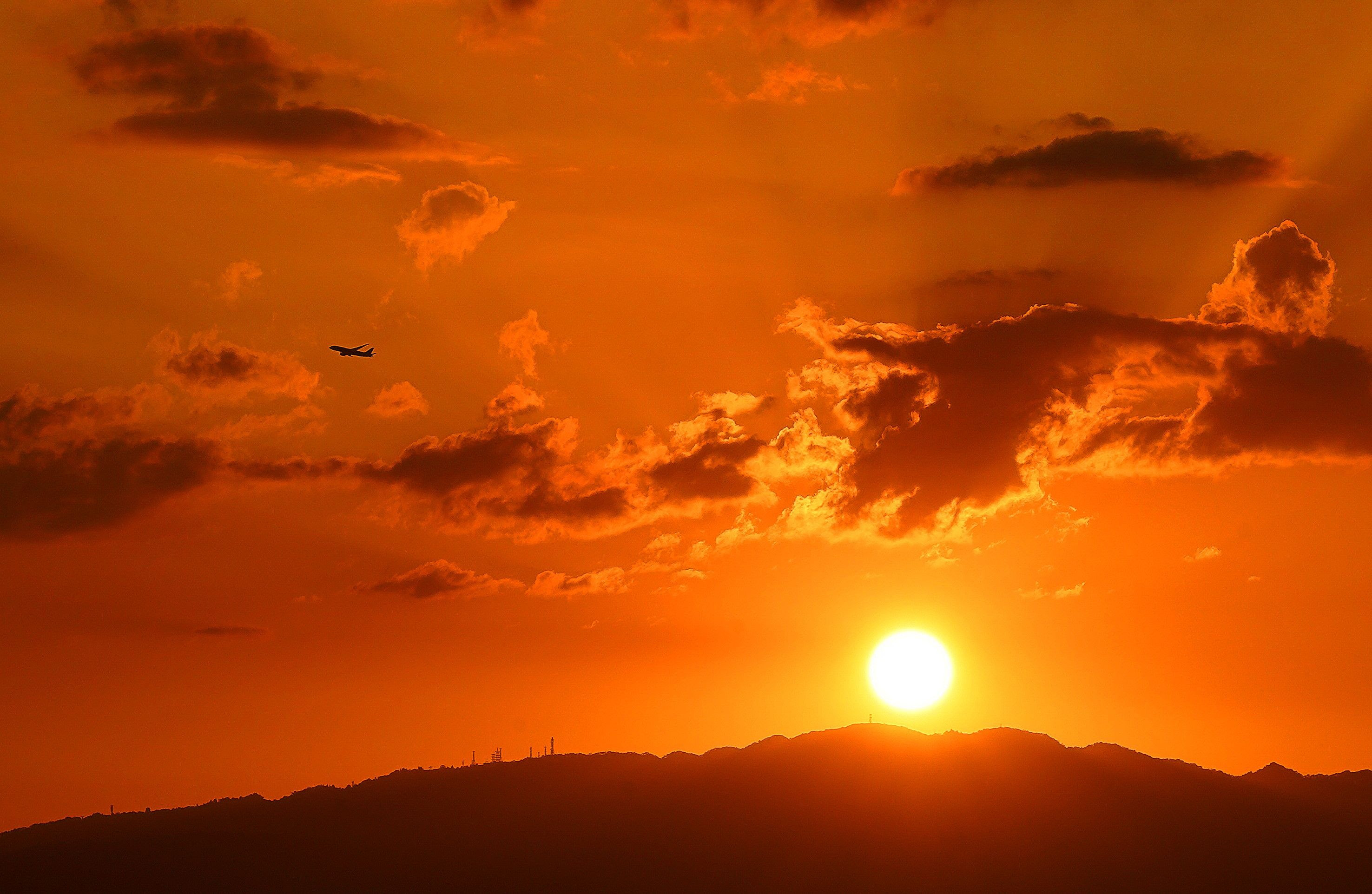 山に沈む夕日を撮っていたら麓の空港から飛び立った 飛行機が太陽の前を旋回して目的地に向かっていった。 よく目を凝らして見て欲しい!確かに飛行機が飛んでいる!