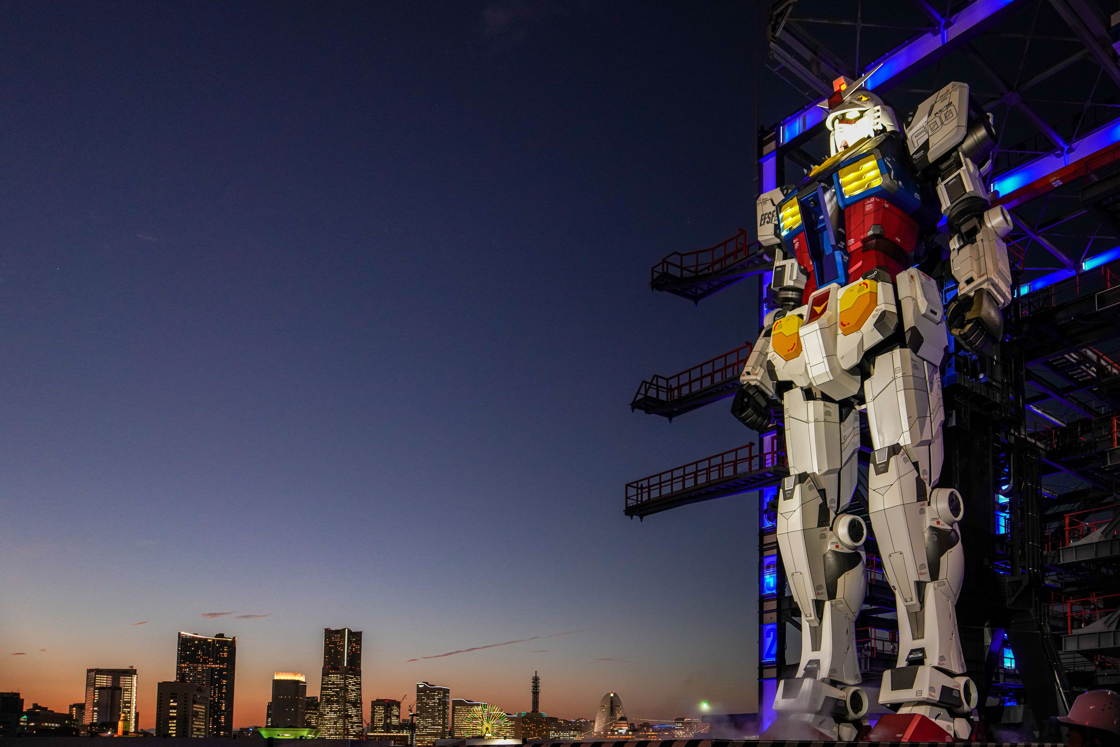 ガンダムファクトリー、横浜みなとみらいの夜景をバックに。