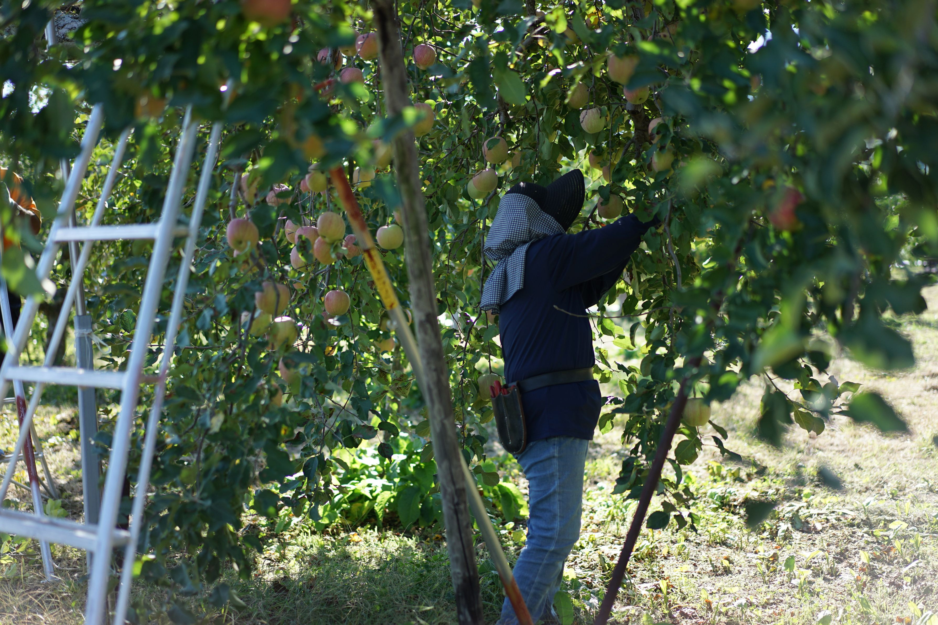 りんご農家さんの葉摘みのお仕事。一個一個丁寧に葉っぱを摘みます。