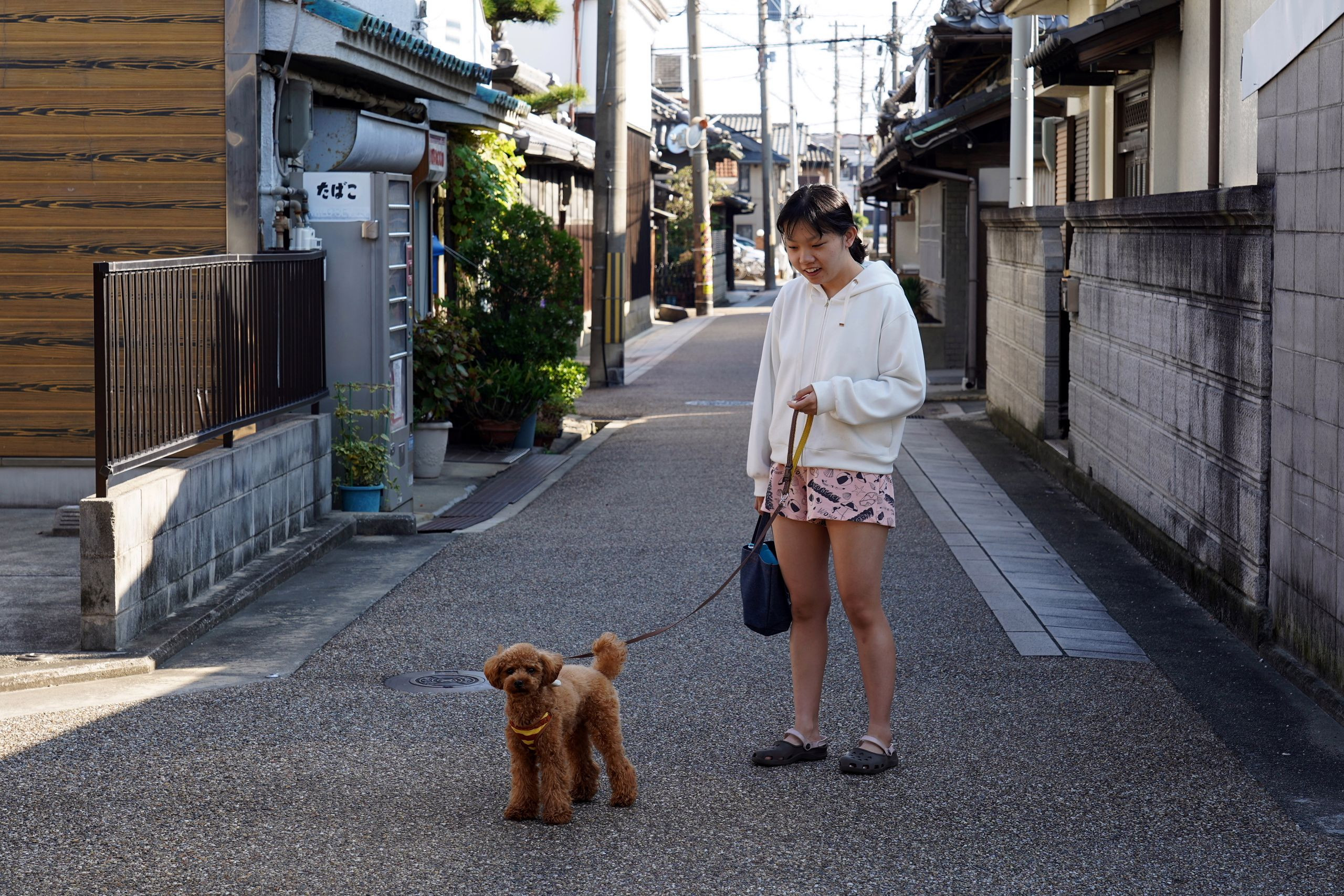 市内の「浜街道」を撮影中に可愛いワンちゃん連れに出会いました。私についてくるので振り返って撮らせて頂きました。