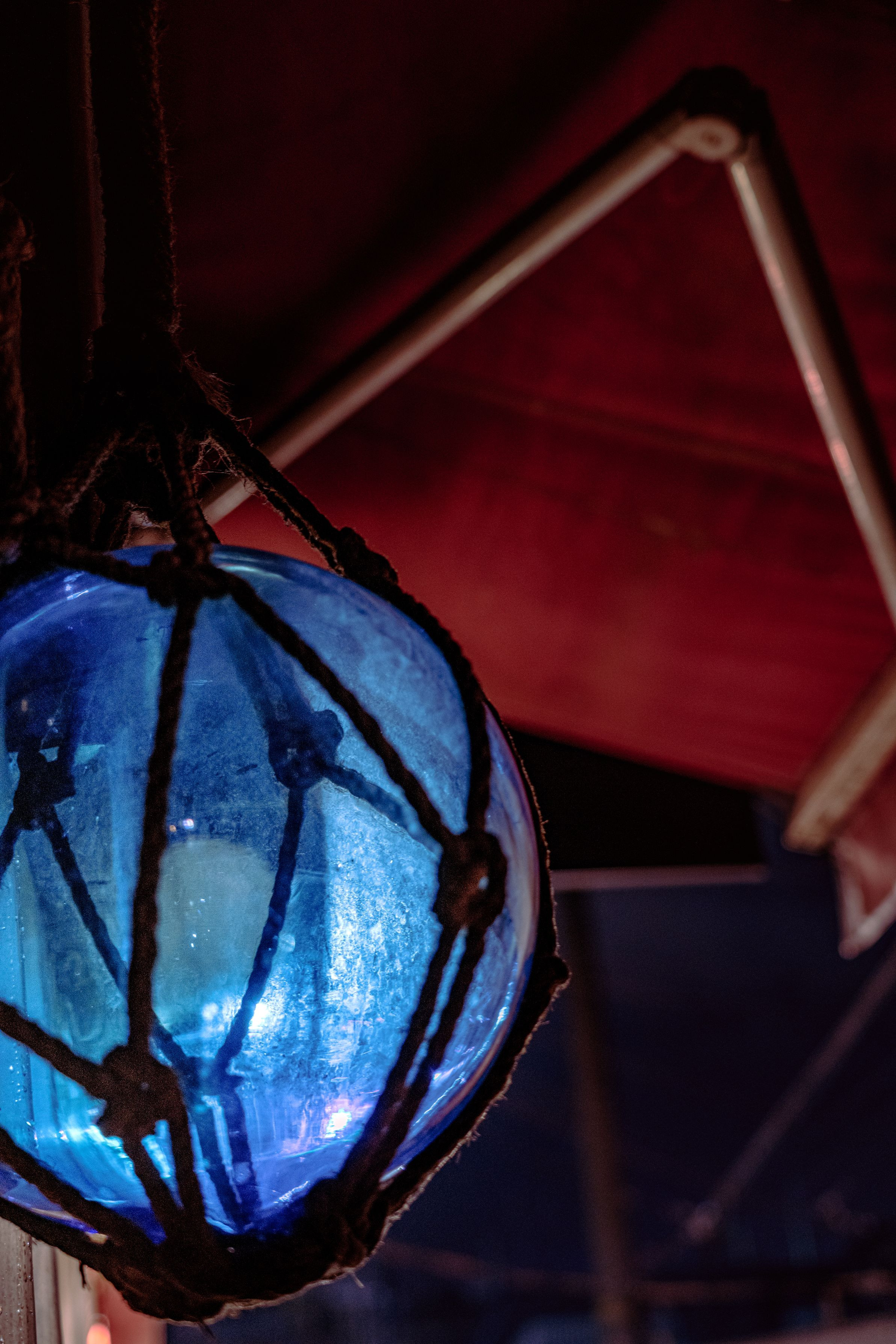 漁業とかで使われるガラス玉の浮きが、小さいお店の目印としてぶら下がっていたのに光が当たっていて綺麗だったので撮影しました😇