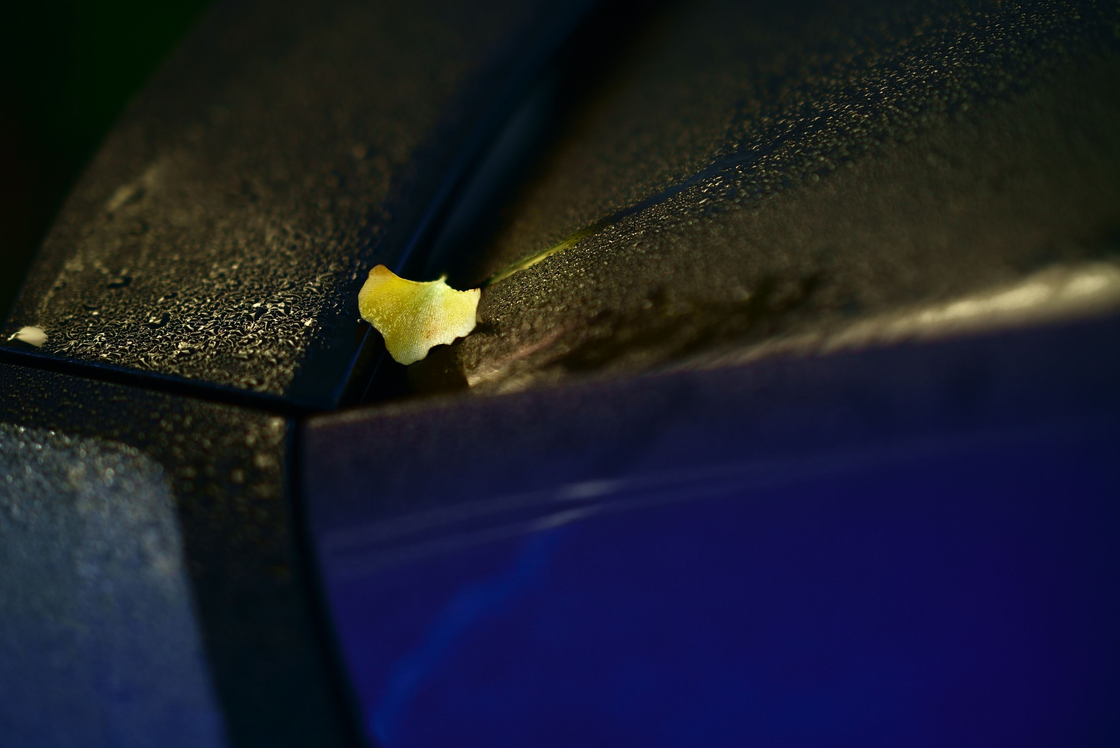 冷えた朝、車のリアウィンドーとイチョウ。夜に飛んできたのかな。