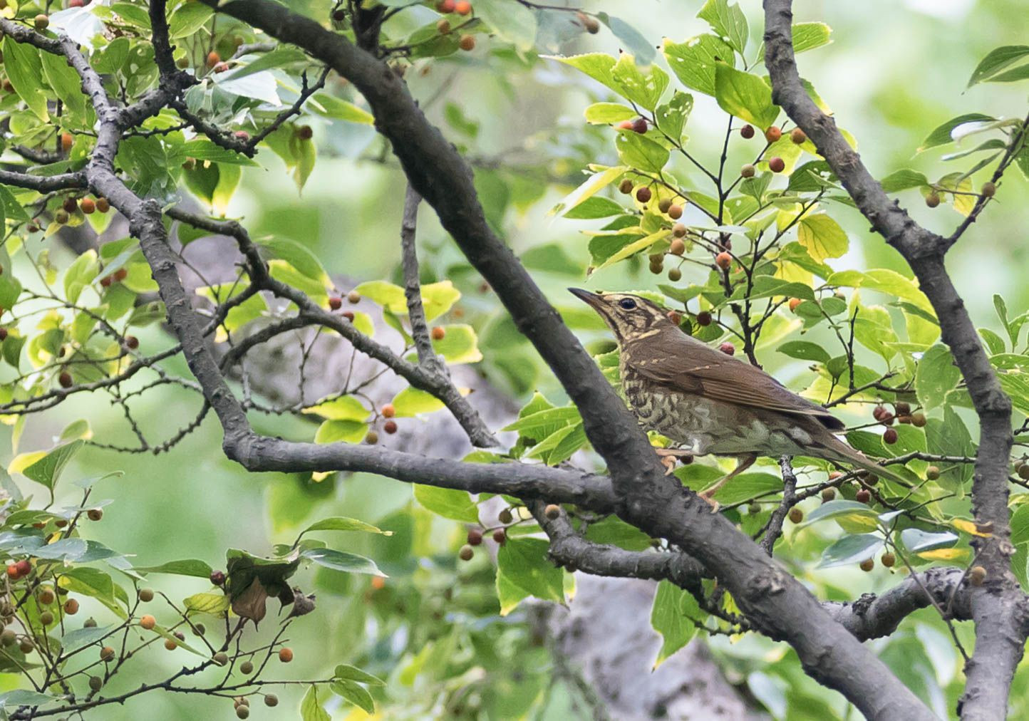 秋の渡り鳥を求め、早朝から現地入りしていた。 早速ヒラヒラ舞うヒタキ系が姿を見せた。 同時に桜の幹をリズミカルに上がる別の鳥が 羽音と出しながら目視できない桜の高所に消えた。 のち、40分程経った頃、エノキに舞い降りたマミジロのメス。