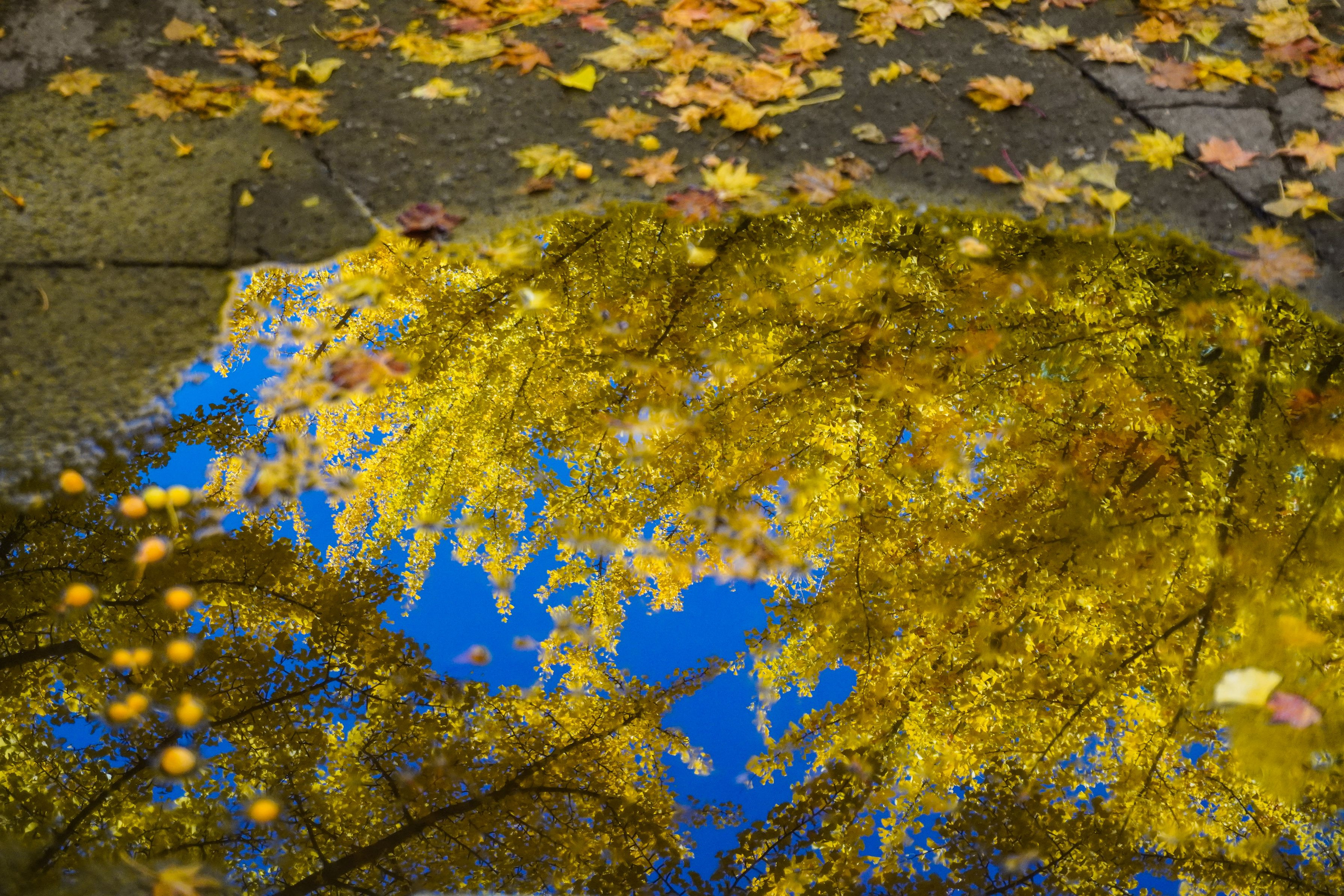 北大イチョウ並木の水たまりで撮影しました。