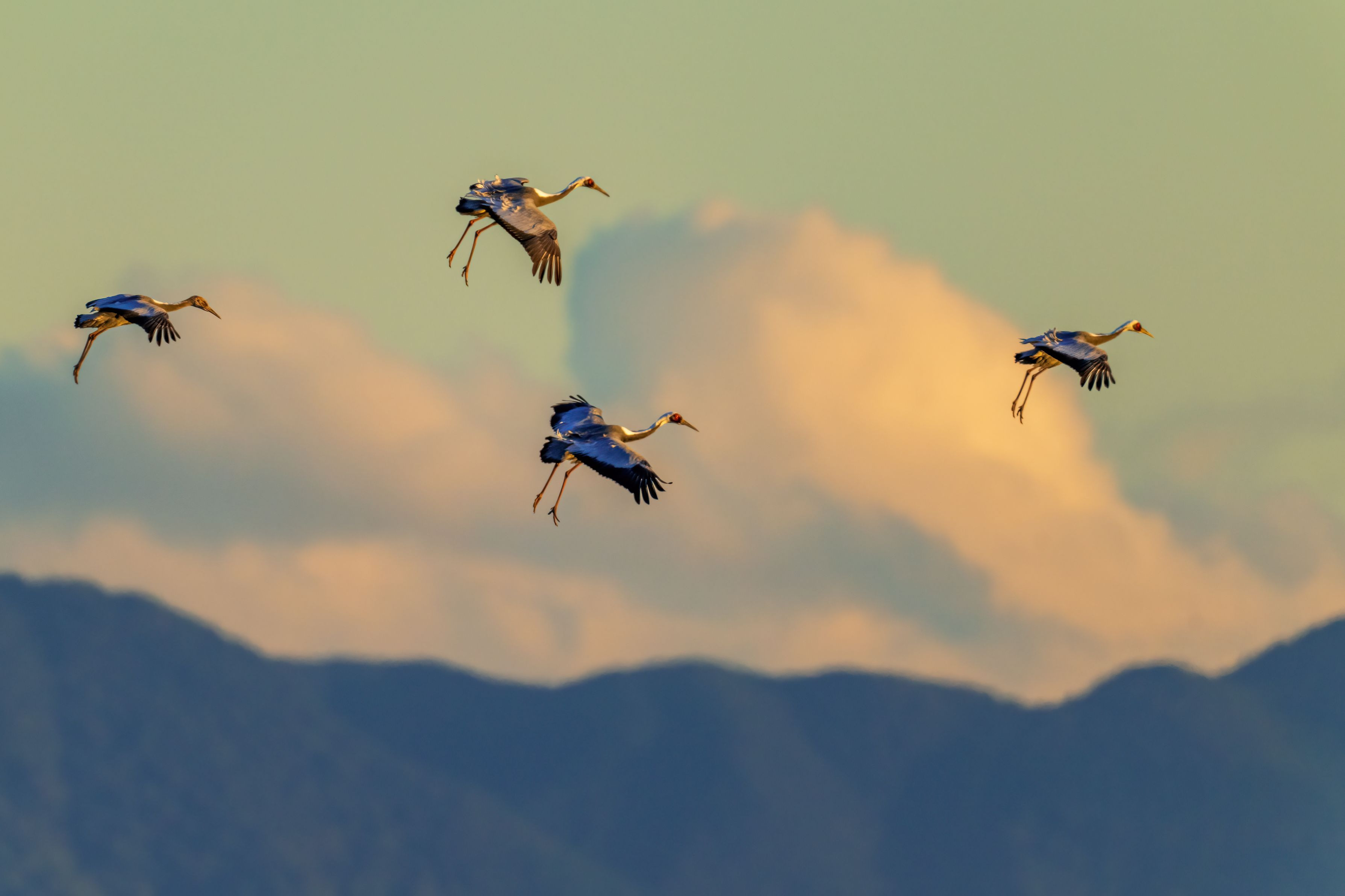 越冬のため、高いところから次々と鶴が渡ってきます。 一気に高度を下げるために足を出しています。