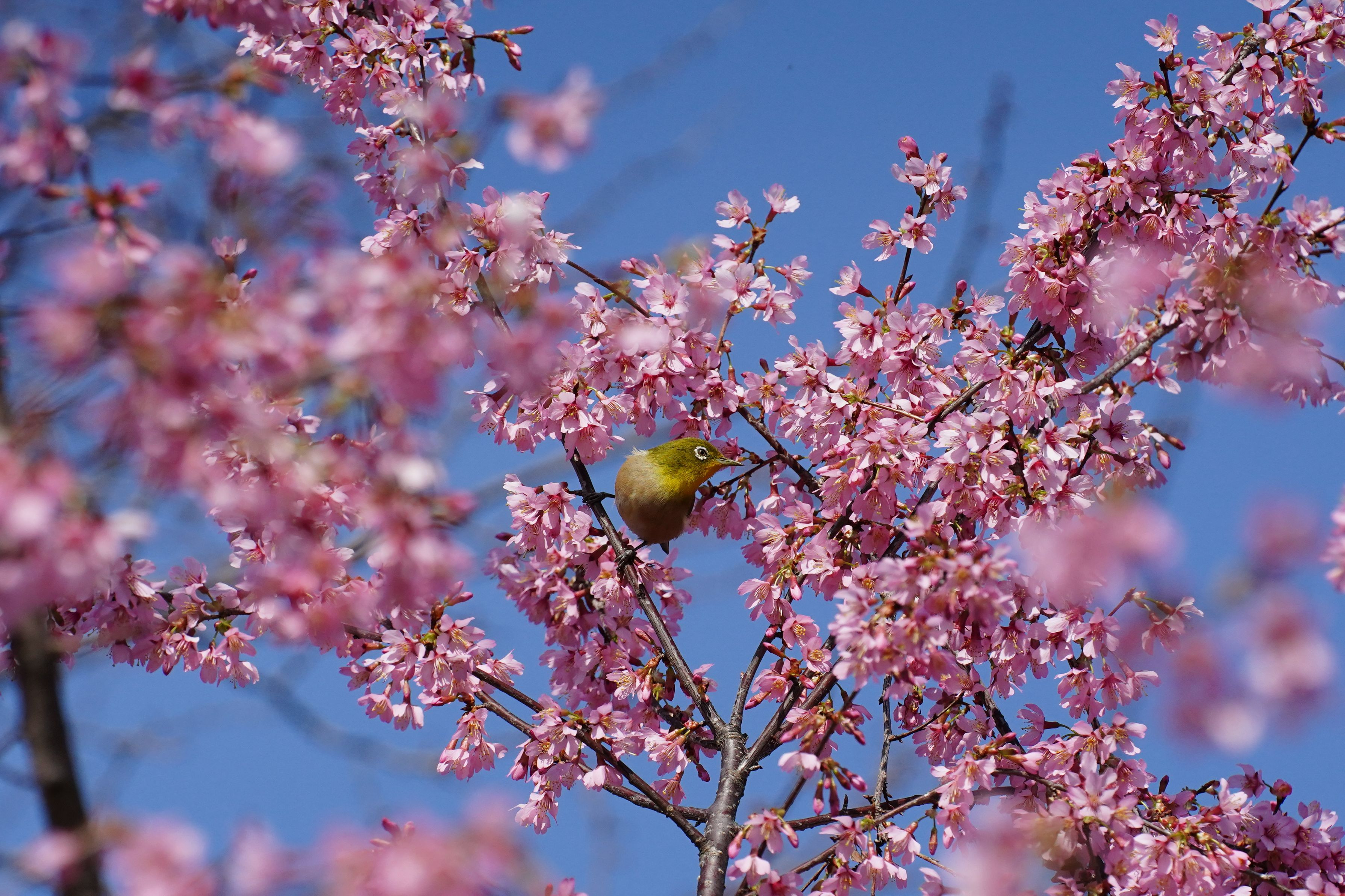 メジロが花の蜜を探している様子