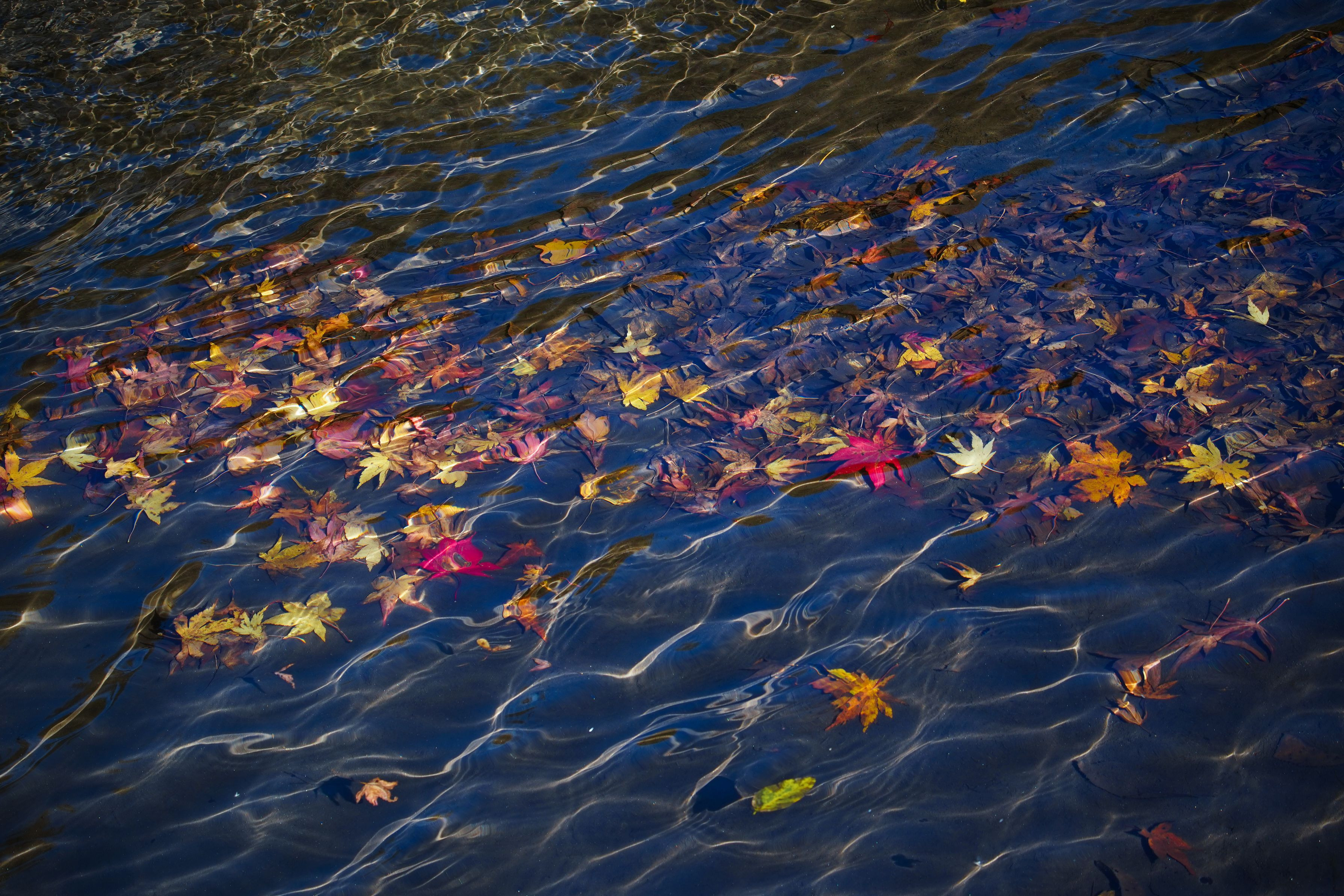 浅瀬に集まった散りモミジ 小滝の落水のゆらめきが沈んだ葉を揺らす