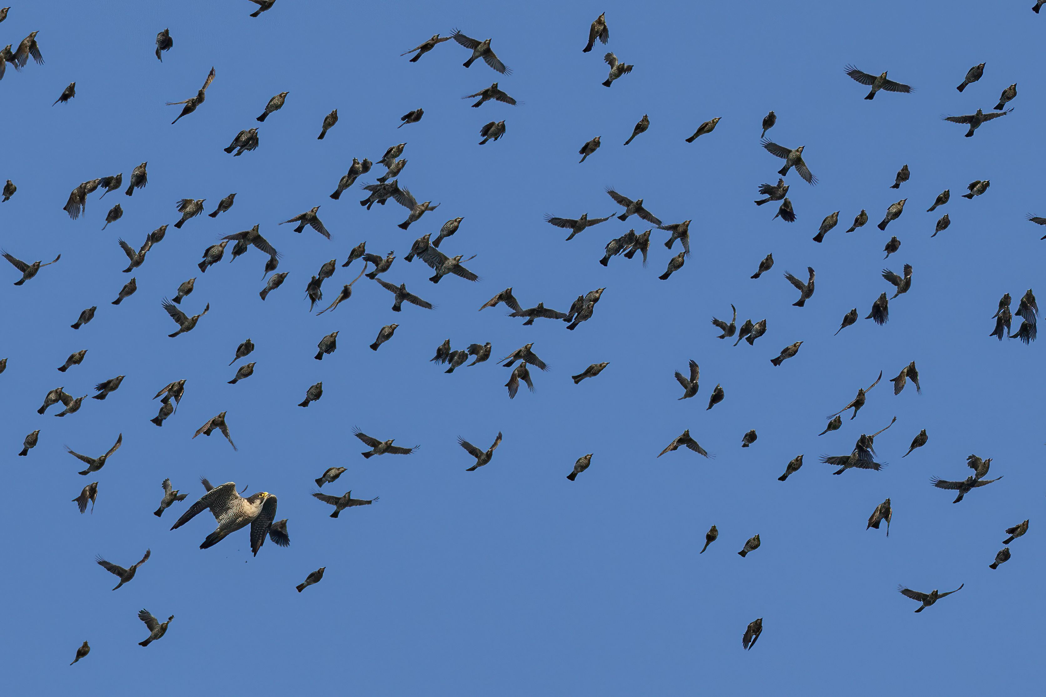 渡るヒヨドリを襲うハヤブサ。 上に逃げるとそこには???