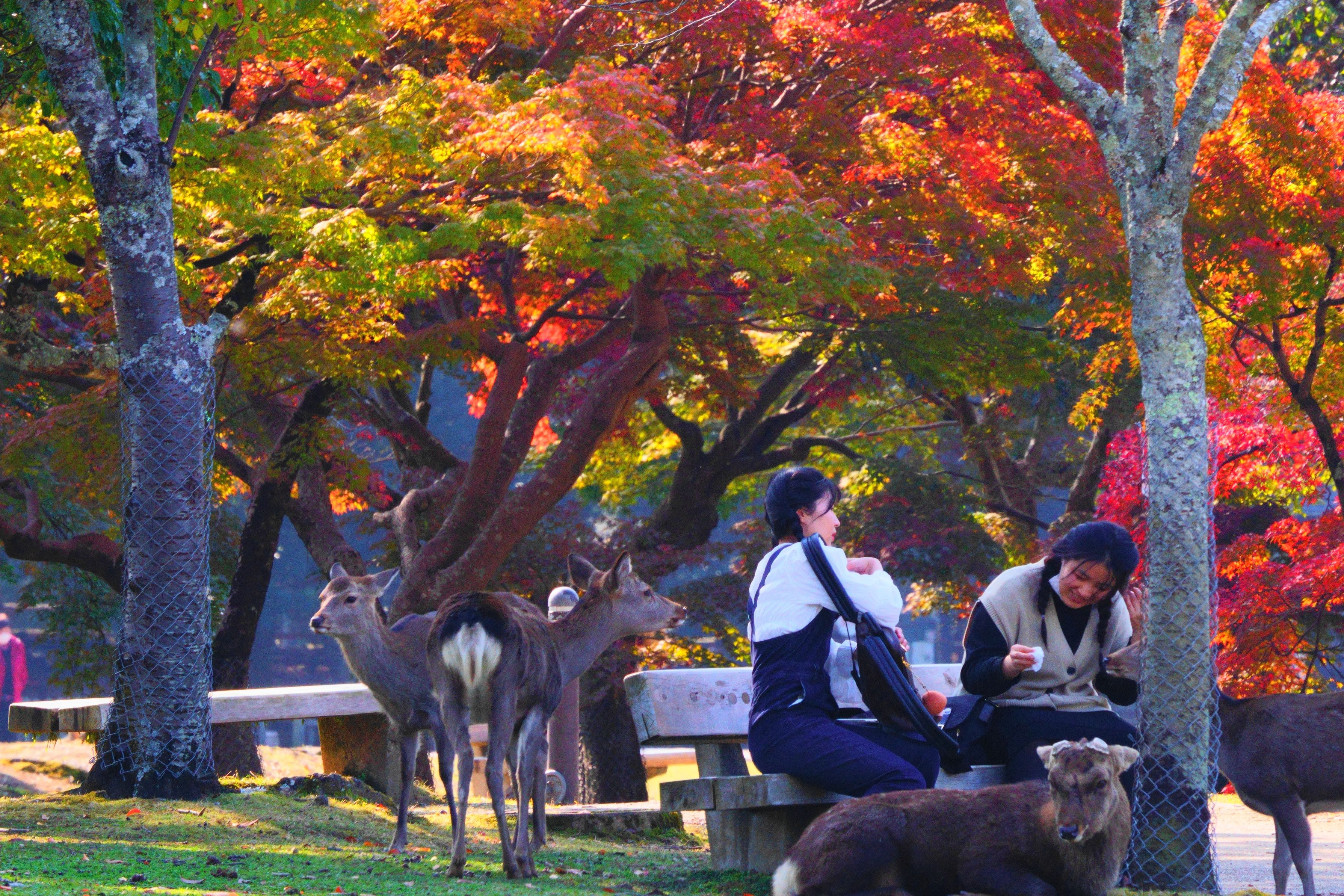 奈良公園にて紅葉を楽しむ。