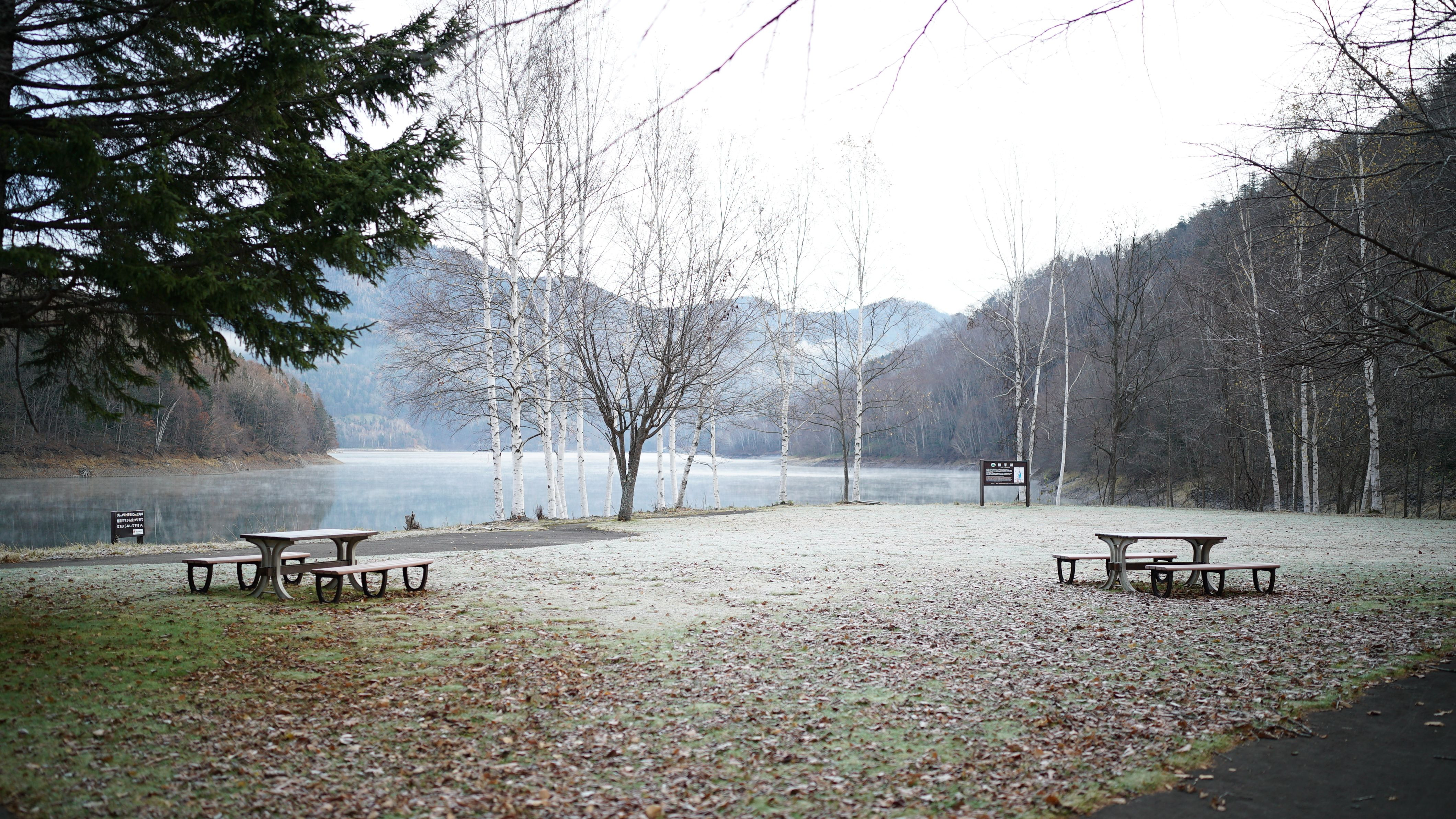 糠平湖キャンプ場の朝。霜が降り、色が消されていく。湖からも うっすらと蒸気がでてる。