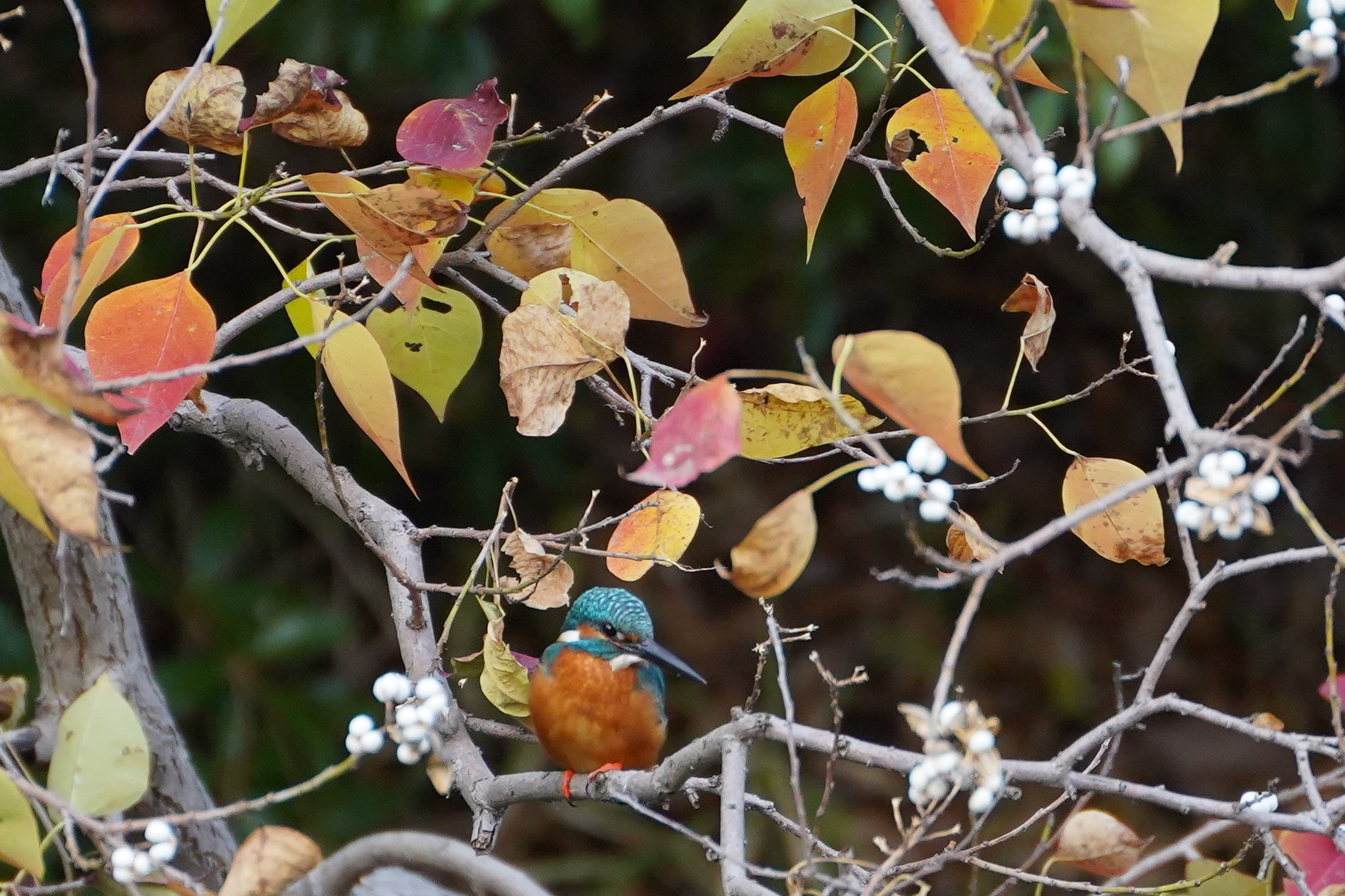 紅葉した色とりどりの葉っぱとカワセミ君のコントラストがいい感じです