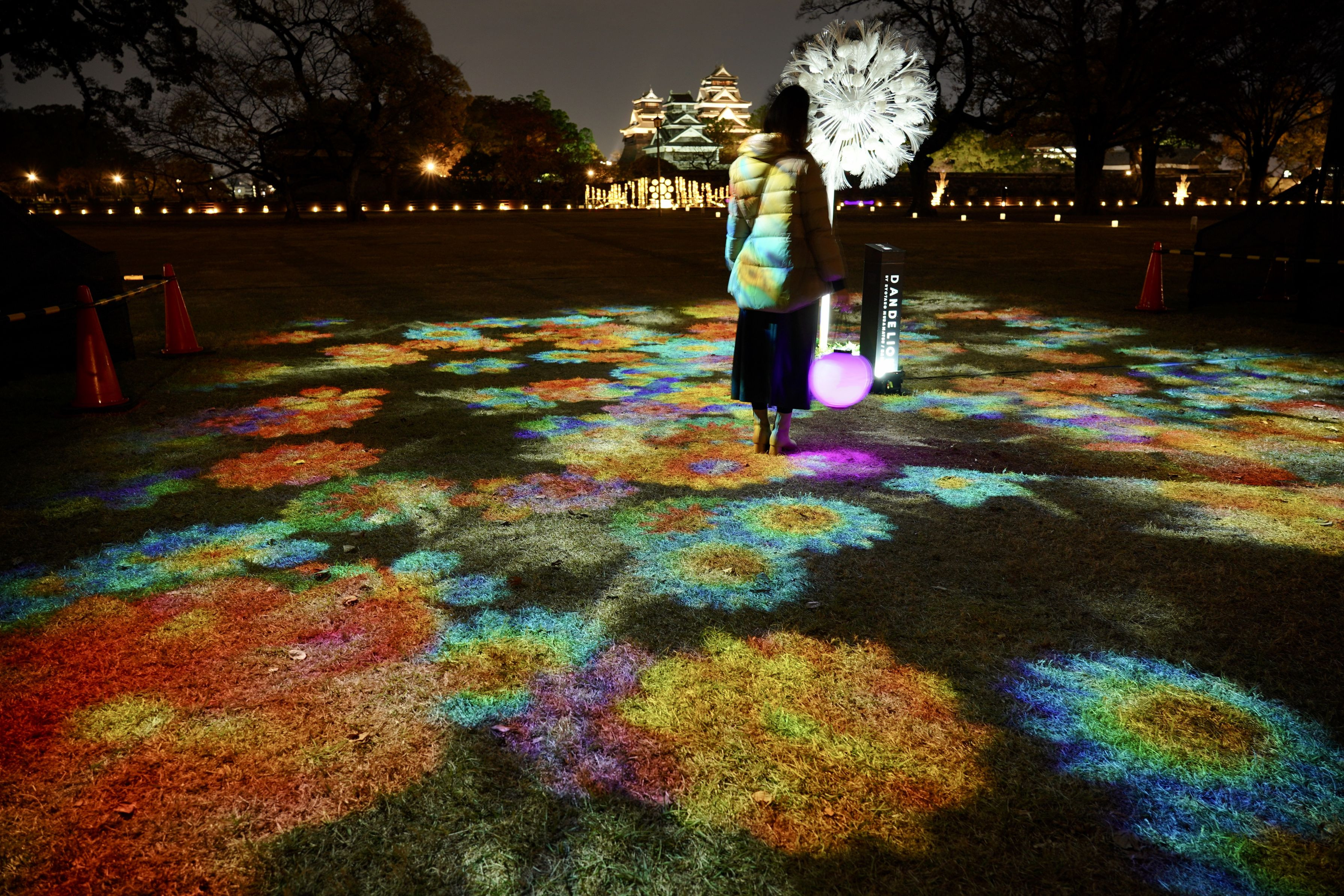 芝生に映し出された色鮮やかな花の絨毯。奥には名城が浮かび幻想的な雰囲気でした。