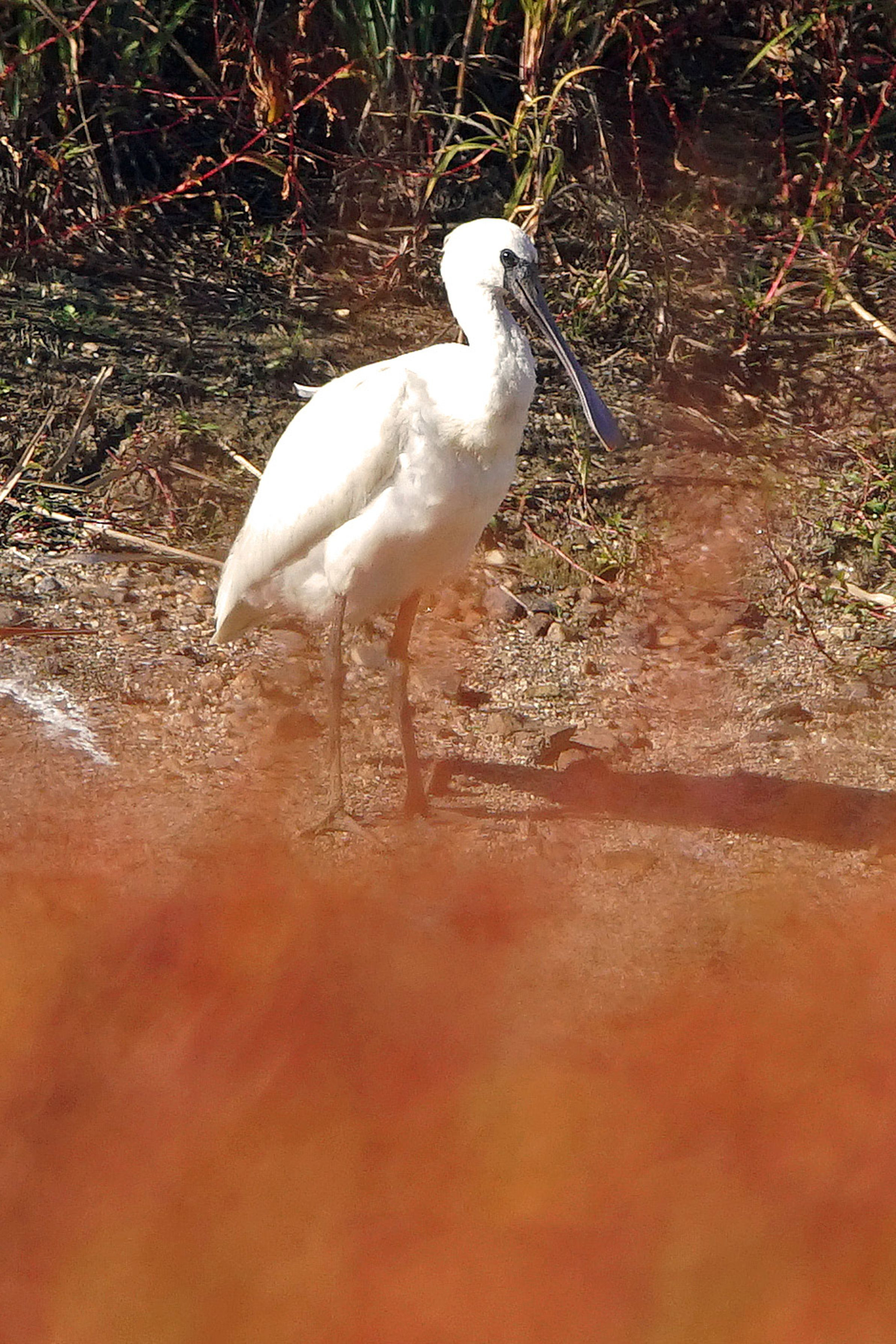 マイフィールドの河川敷の池にクロツラヘラサギが飛来した。 池の周りには、タデ?が赤色に染まっていた。