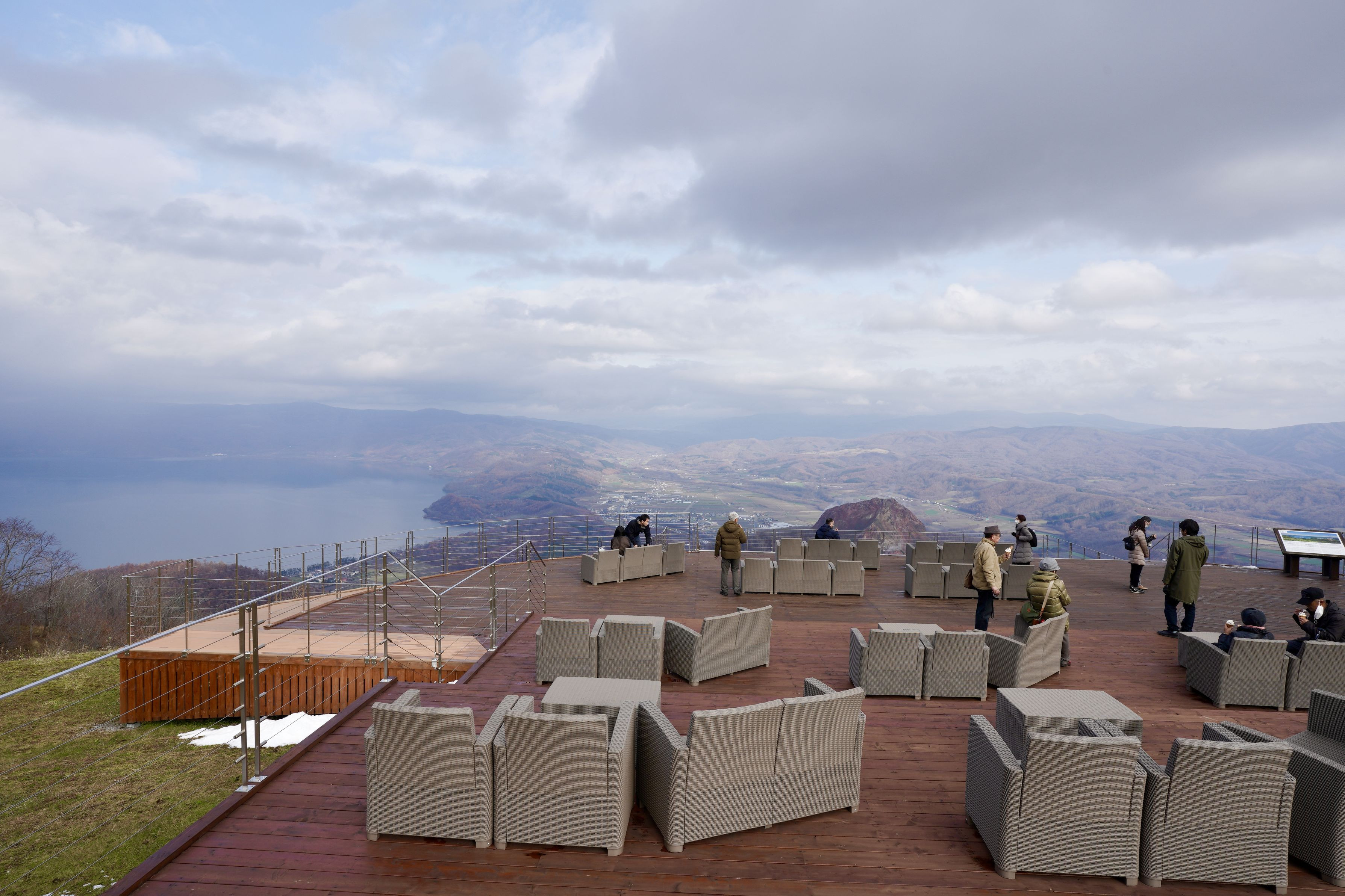 ロープウェイに乗って展望デッキに来ました。 左側に洞爺湖、中央に見えるのは昭和新山です。 先日、山頂に雪が降りましたが、皆さんソフトクリームを召し上がっていました。 寒む!