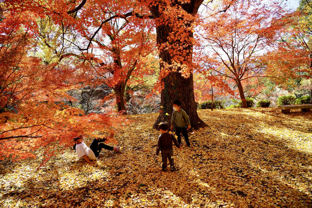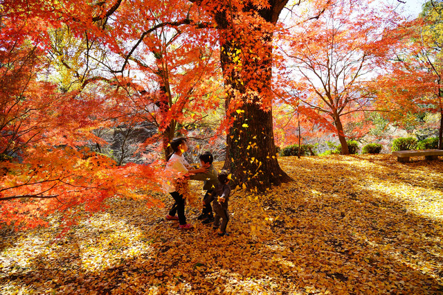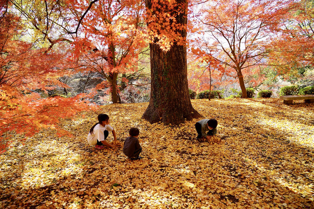 綺麗な紅葉に黄金の絨毯の上で、銀杏の葉の掛け合い〜とても楽しそうでした。