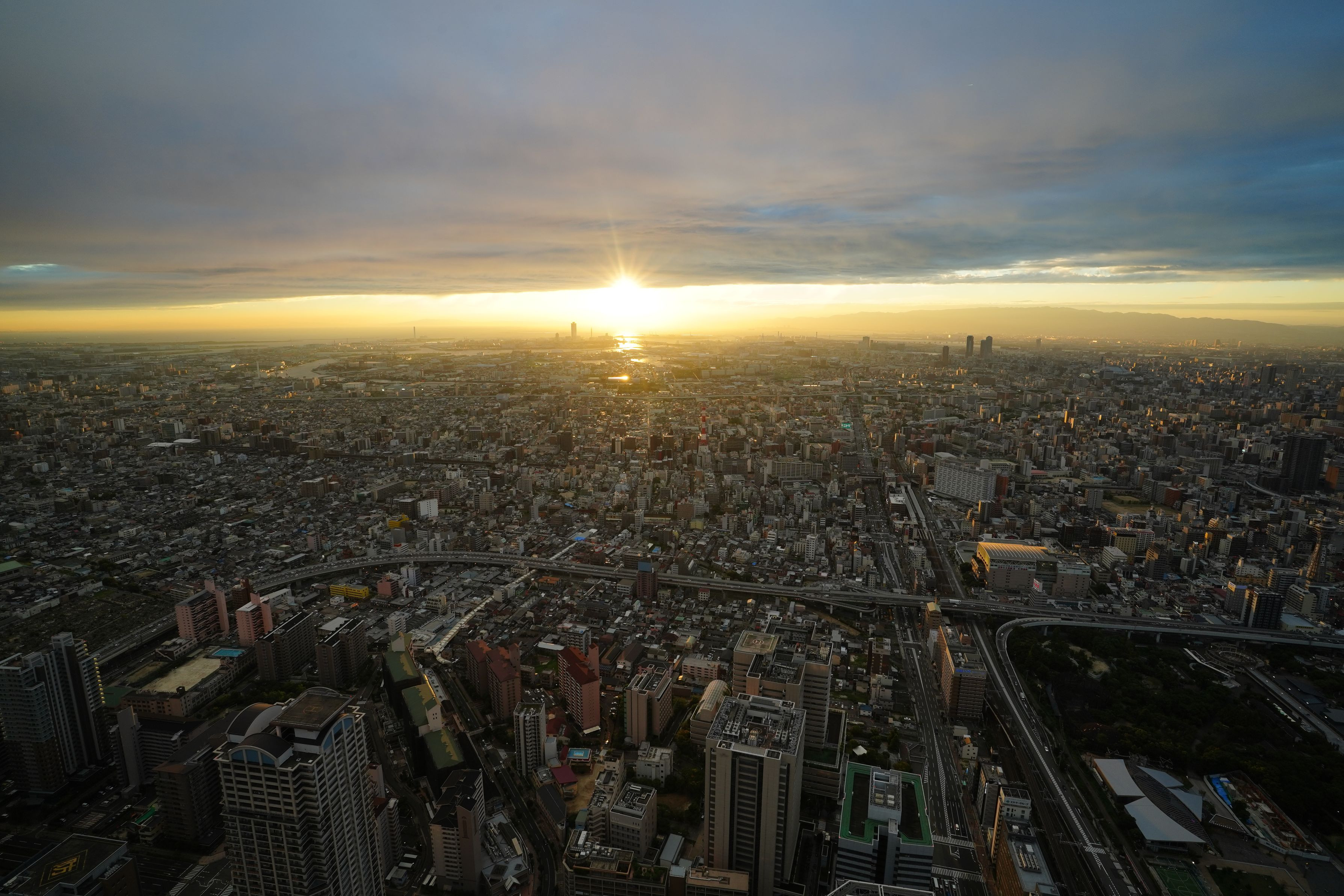 雲の隙間から夕日が差し込んで都会を照らしています