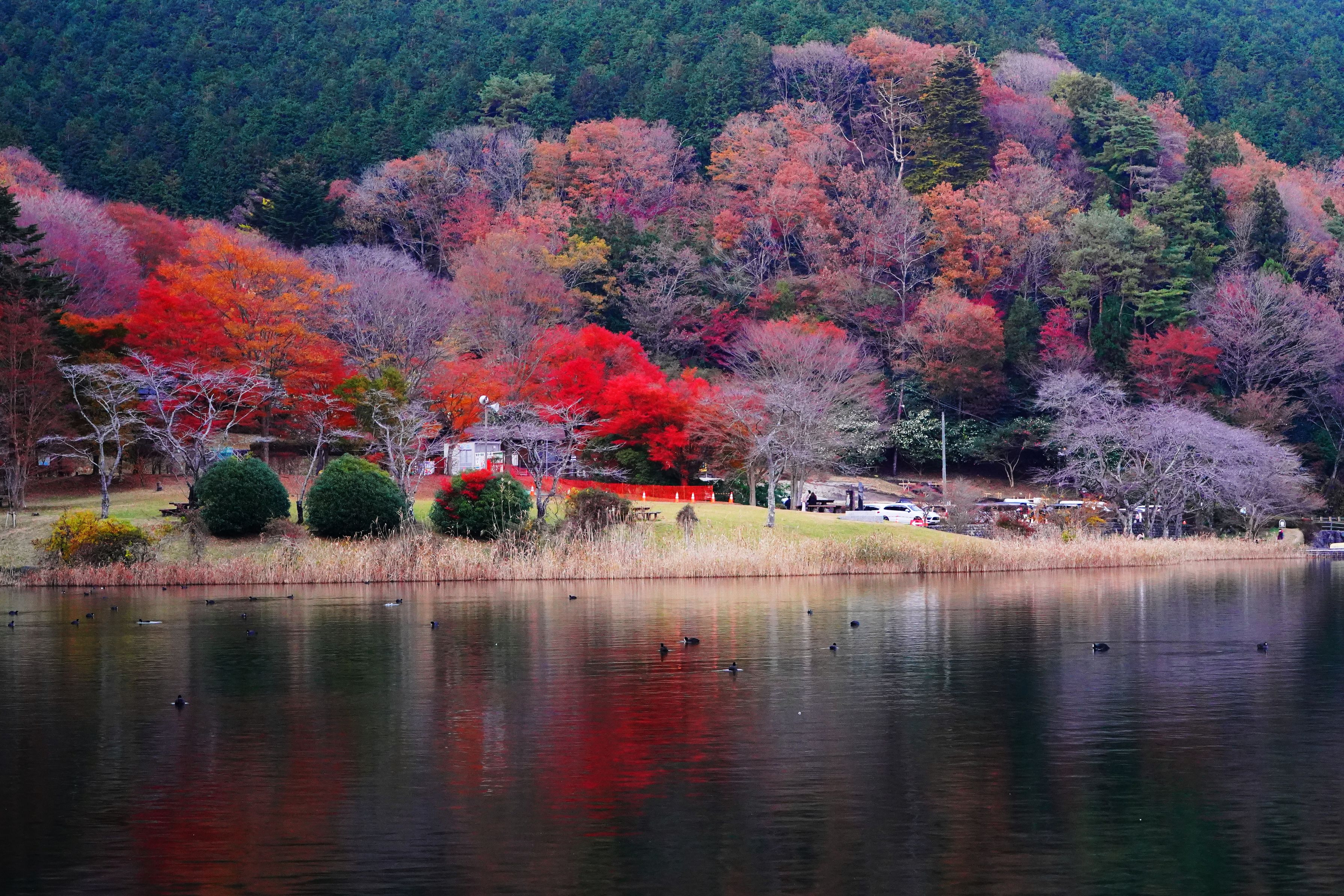 鏡に写ったような逆さ富士は望めませんでしたが、湖畔の紅葉は見事でした。