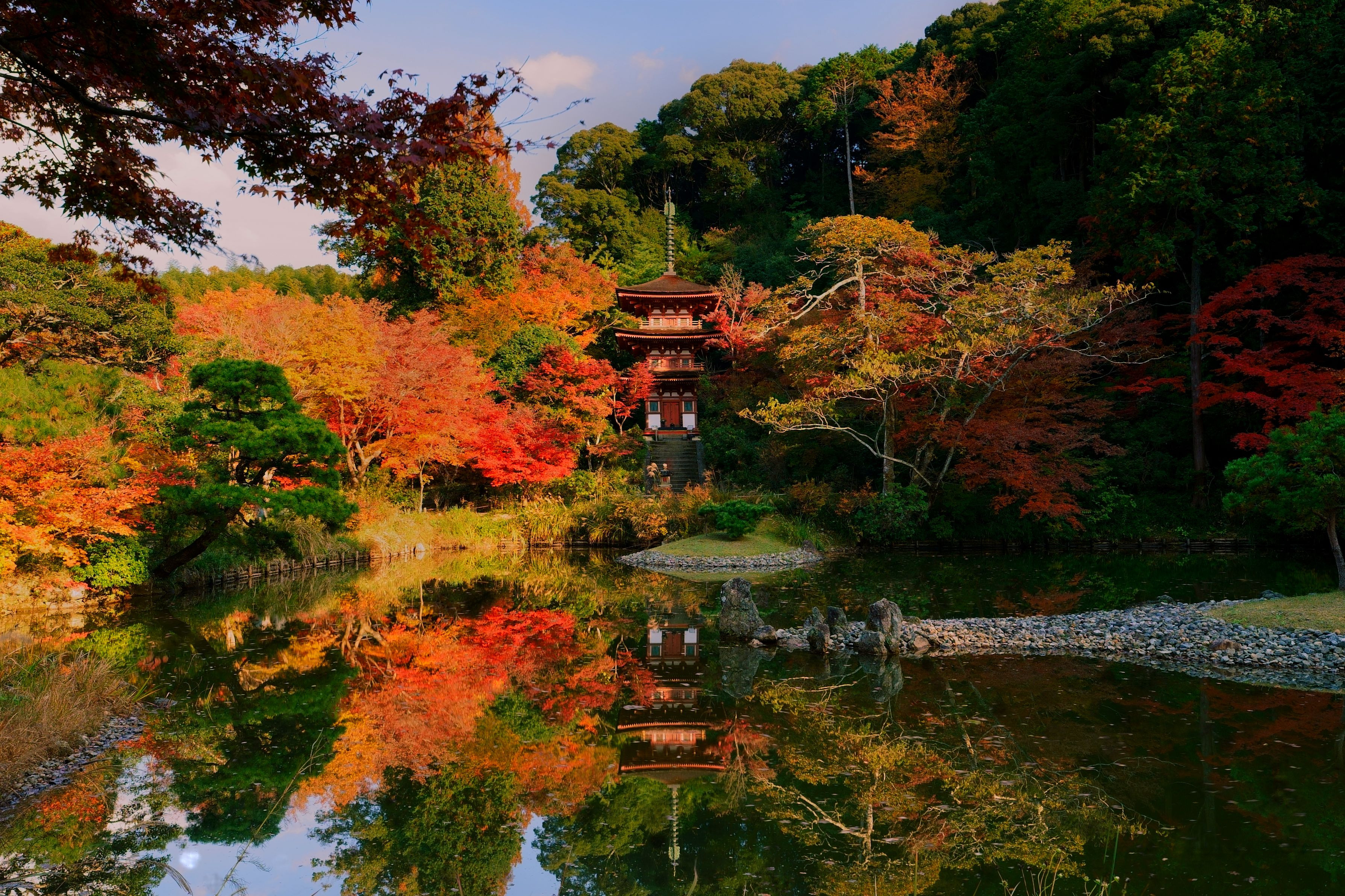 京都府南部の浄瑠璃寺です。紅葉モード。落ち葉などを多少修正しています。落ち葉がなくて,色づいているというタイミングがなかなか難しいですね。20mmですが,クロップしています。
