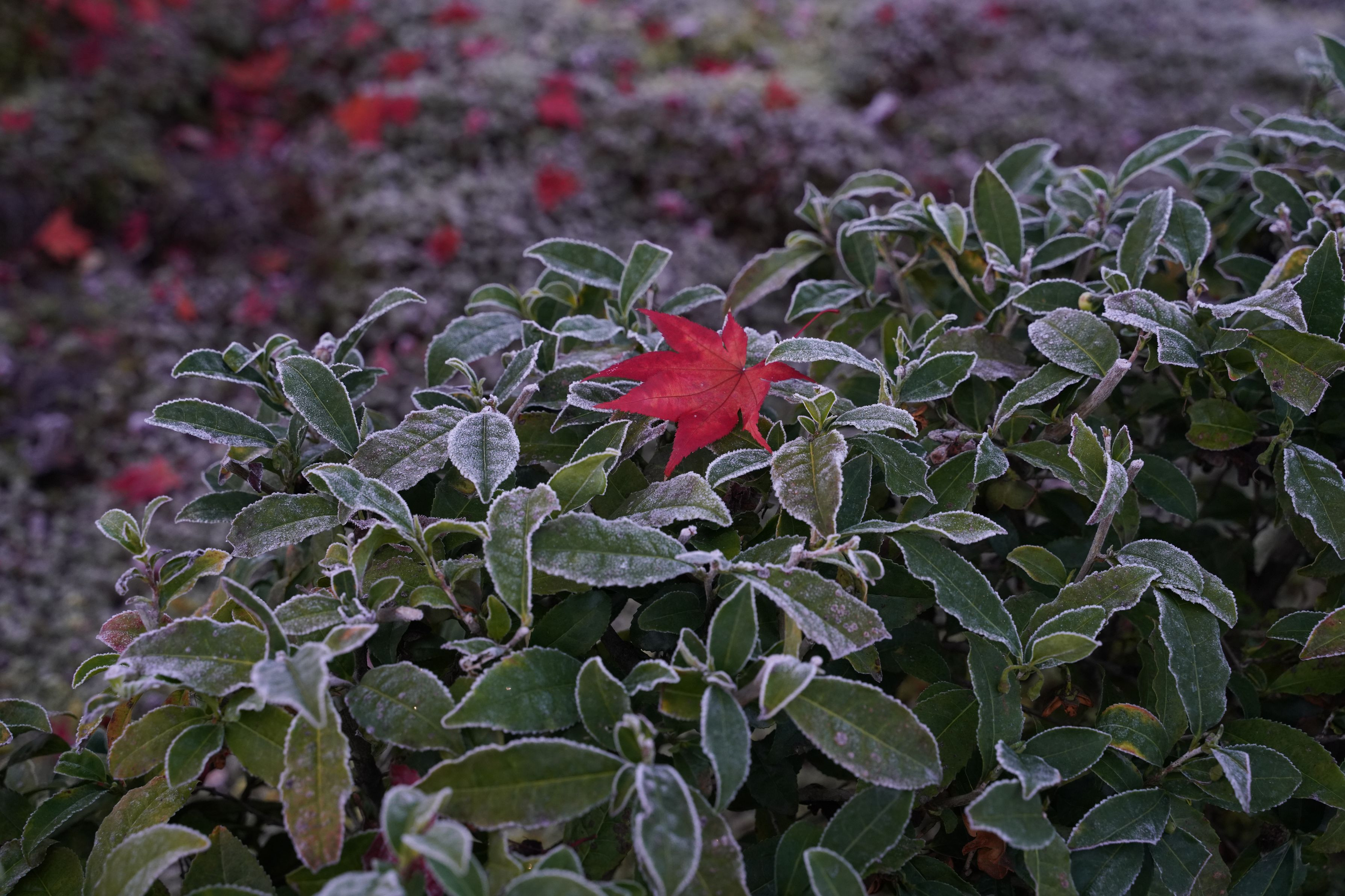 寒い朝、霜の降る山茶花に落ちた紅葉。