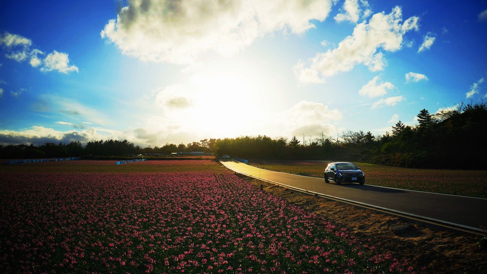 鳥取の特産品の一つ、らっきょう。 意外と知られていませんが、秋にはきれいなピンク~紫色の花を咲かせます。 らっきょう畑とカローラスポーツを逆光で撮影しました。 ※画像は色味など加工しています。