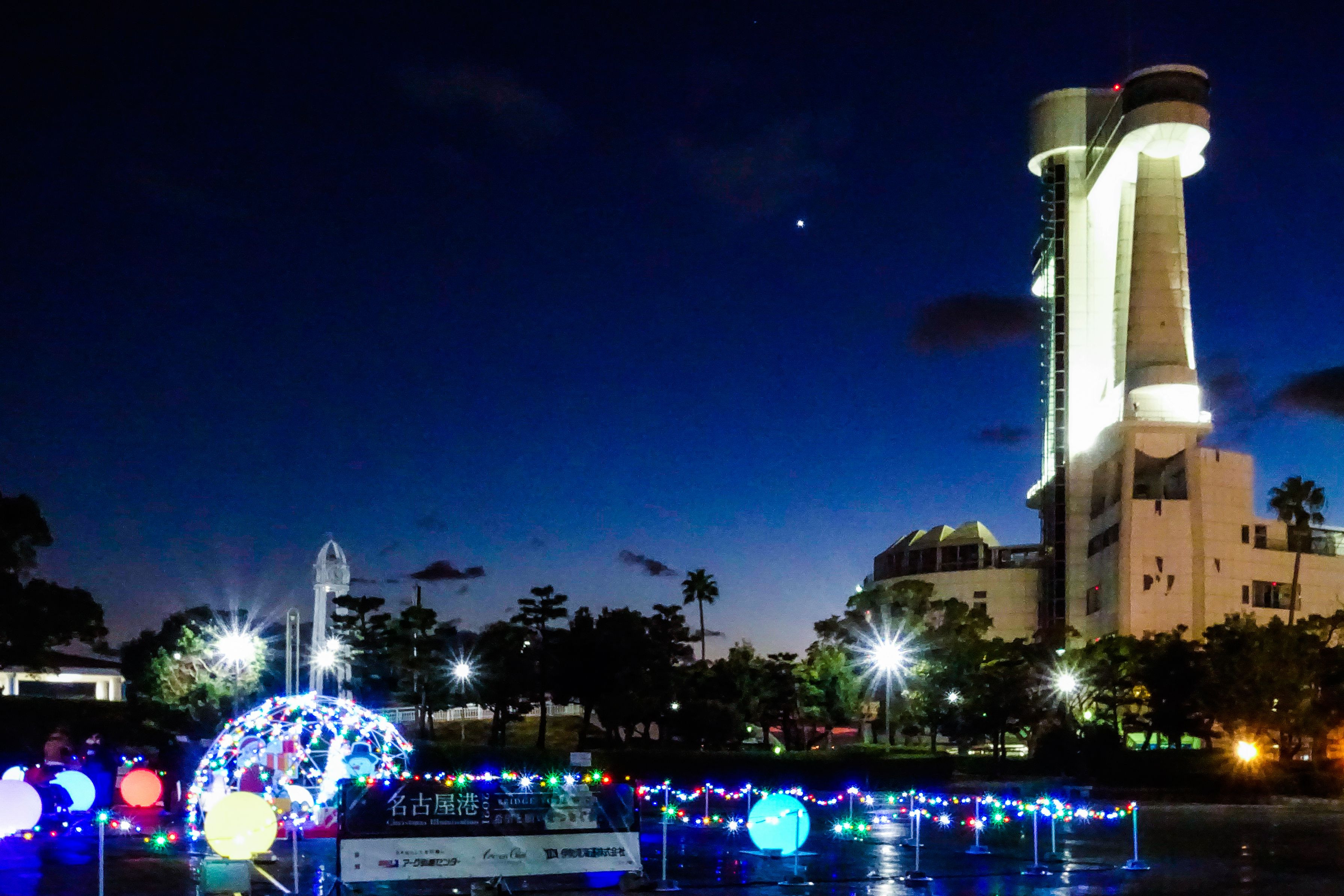 名古屋港のイルミネーションとポートタワーのライトアップの模様を撮影しました。