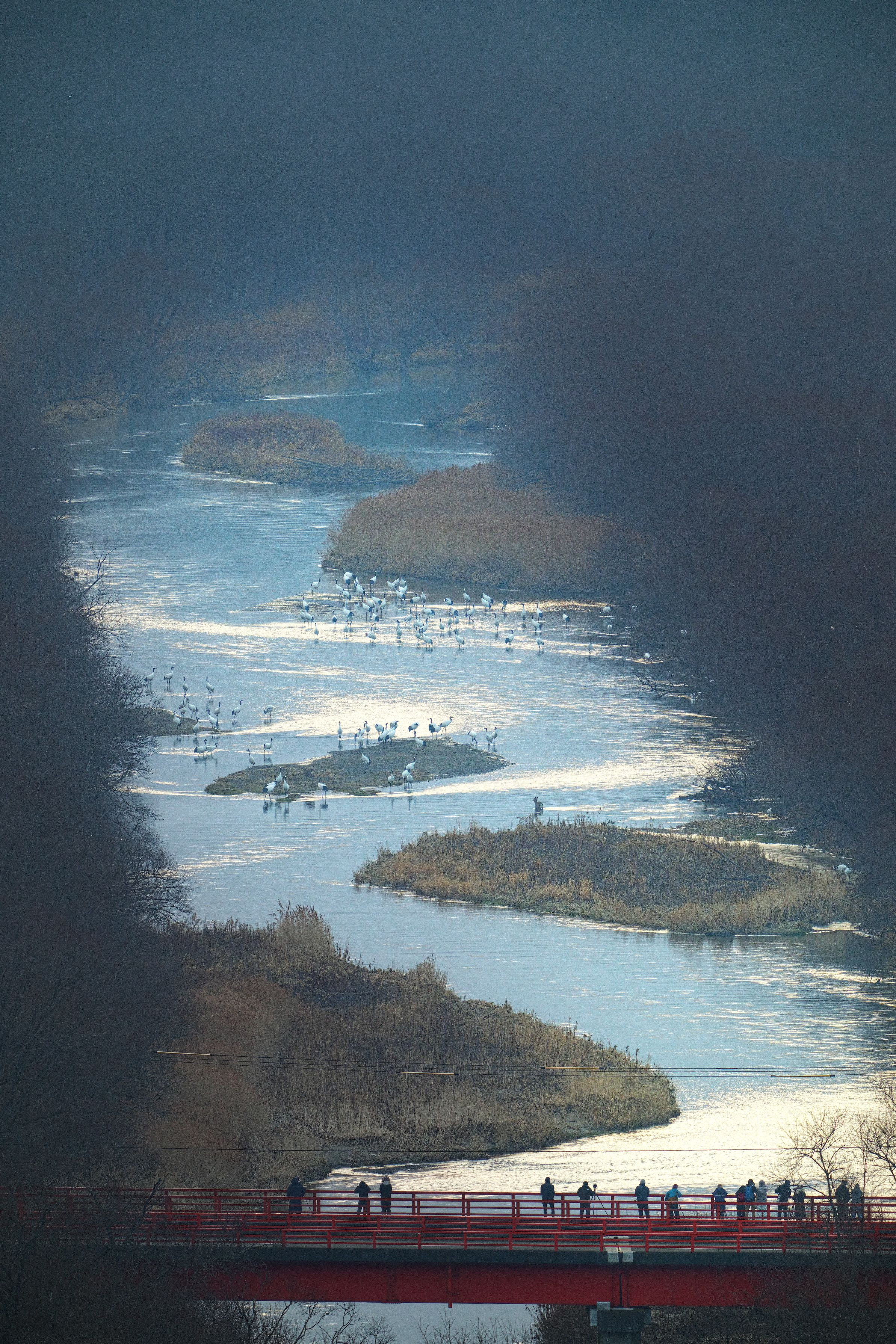 α1+FE 400mm F2.8 GM OSS + 2X Teleconverter えらく被写体ブレするので、「なんで?」と思っていたら、鹿が2頭乱入していました。この後、タンチョウは一気に飛び立っていってしまいました。(>_<) それにしても今年は一向に冷え込みません。(>_<)
