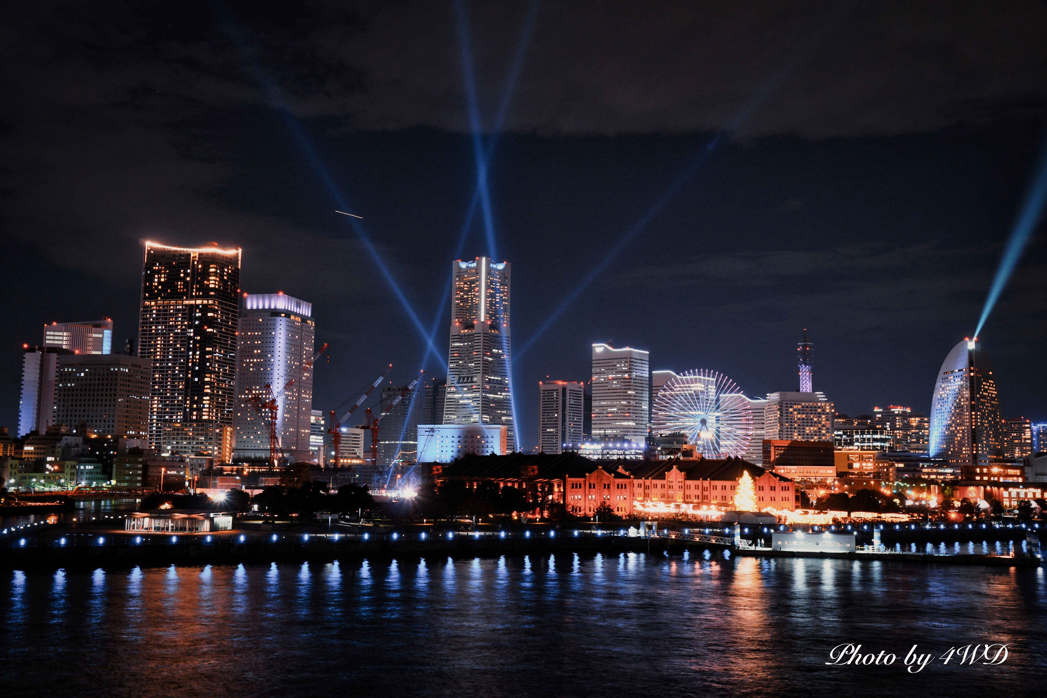 ビームが夜空に照射され、岸にはLEDが輝き、ビルの一部もライトアップされます。 赤レンガ倉庫ではクリスマスマーケットが開かれ、クリスマスツリーも点灯しています。