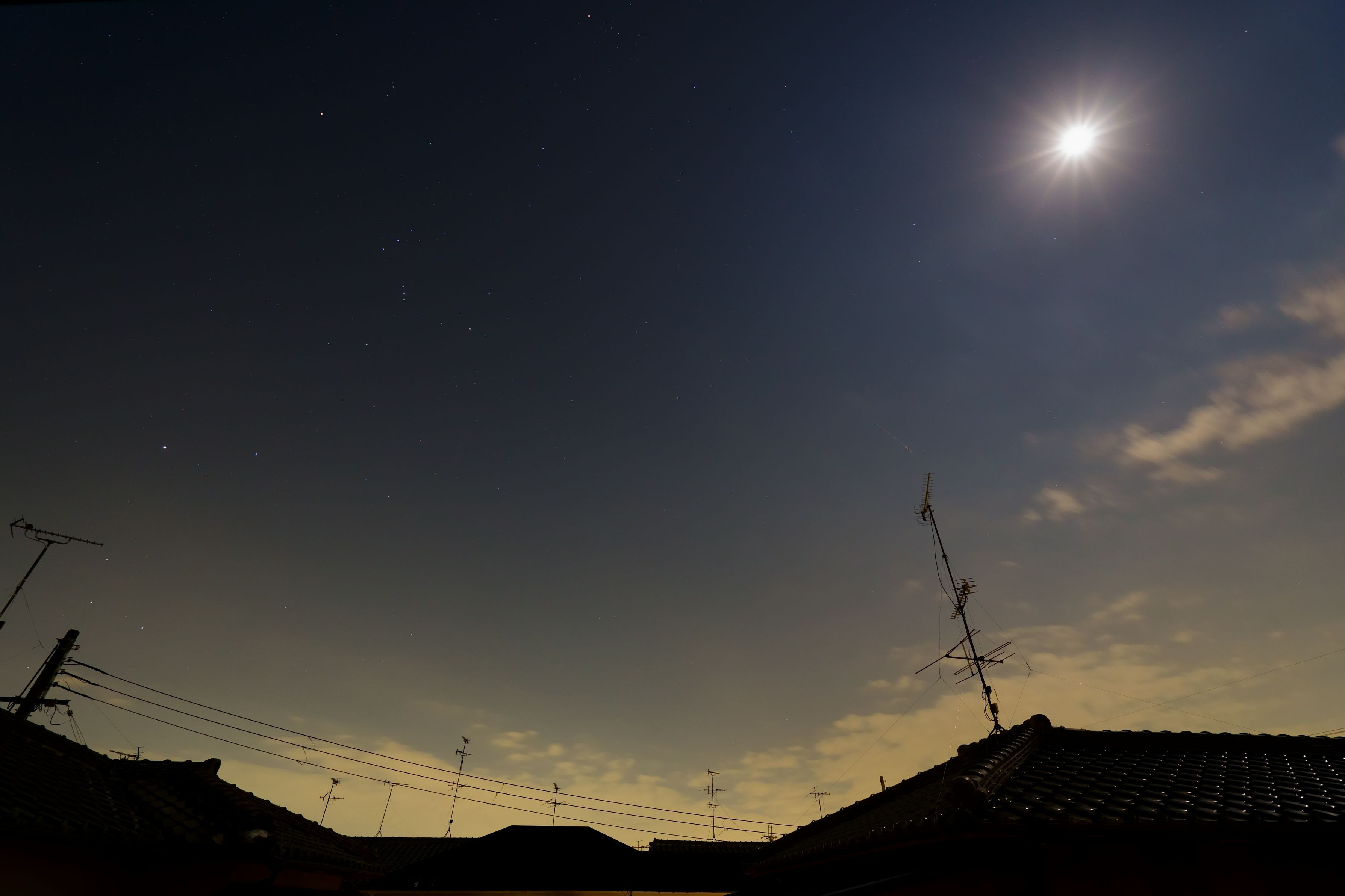 月が太陽の様に輝いてましたが、アンテナの上に流星。 ※明るさ調整しています。