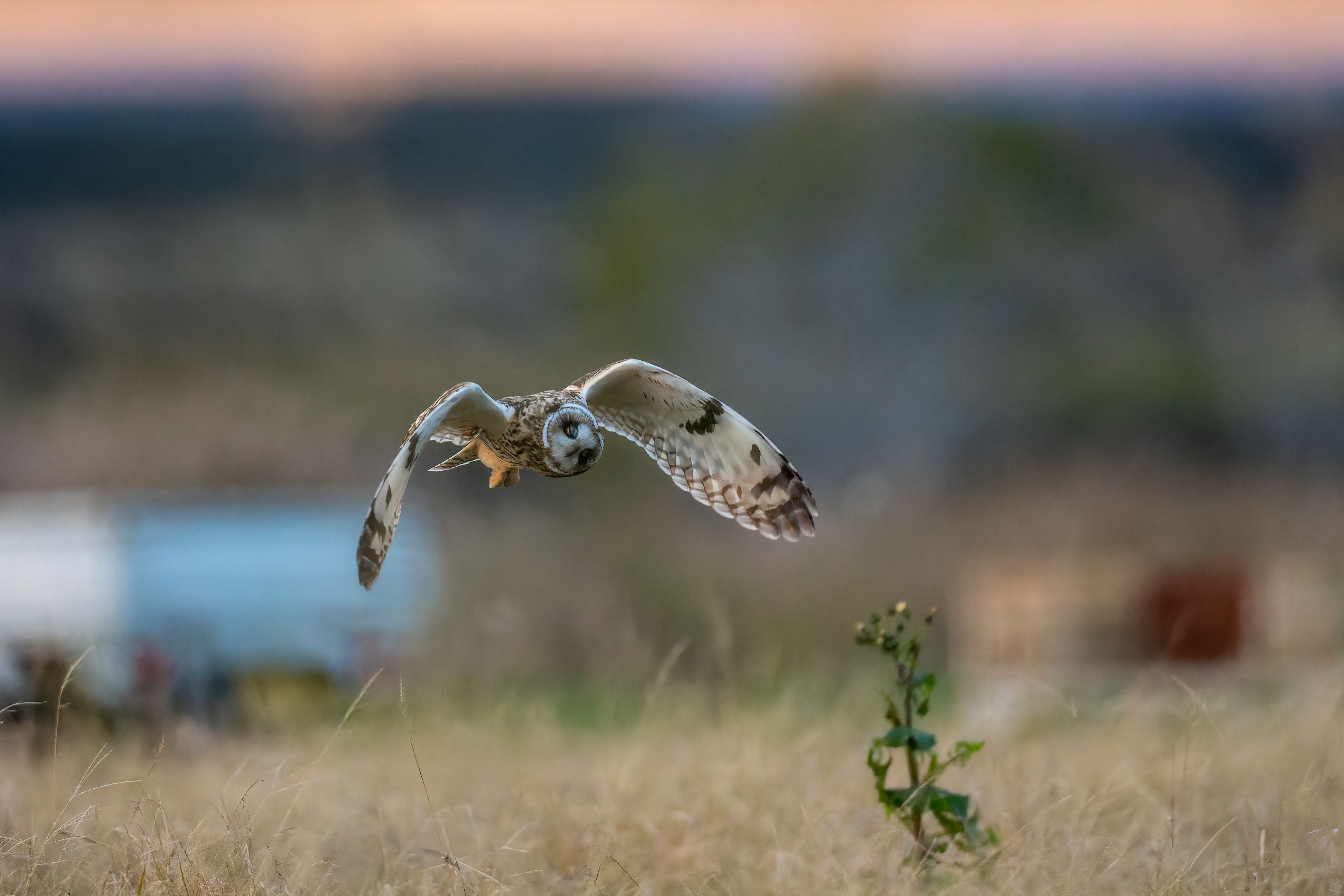 狩りに失敗したコミミズク。 あー失敗と思ったのでしょうか?頭を振りながら目をつぶっています。